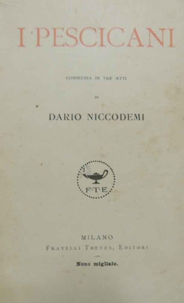 Dario Niccodemi, I pescicani. Commedia in tre atti, Fratelli Treves Editori, Milano 1922, nono migliaio, pp. 186, cm 19, br. ed. Tracce d’uso, una piccola mancanza al dorso, uniforme brunitura della carta, ma nel complesso copia ancora in condizioni accettabili e perfettamente fruibile.