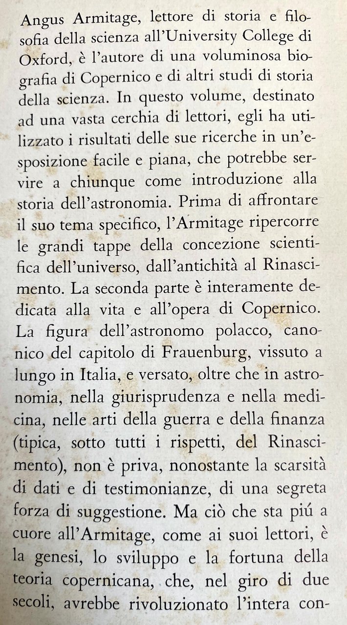 Angus Armitage, lettore di storia e filosofia della scienza all'University College di Oxford, è l'autore di una voluminosa biografia di Copernico e di altri studi di storia della scienza. In questo volume, destinato ad una vasta cerchia di lettori, egli ha utilizzato i risultati delle sue ricerche in un'esposizione facile e piana, che potrebbe servire a chiunque come introduzione alla storia dell'astronomia. Prima di affrontare il suo tema specifico, l'Armitage ripercorre le grandi tappe della concezione scientifica dell'universo, dall'antichità al Rinascimento. La seconda parte è interamente dedicata alla vita e all'opera di Copernico. La figura dell'astronomo polacco, canonico del capitolo di Frauenburg, vissuto a lungo in Italia, e versato, oltre che in astronomia, nella giurisprudenza e nella medicina, nelle arti della guerra e della finanza (tipica, sotto tutti i rispetti, del Rinascimento), non è priva, nonostante la scarsità di dati e di testimonianze, di una segreta forza di suggestione. Ma ciò che sta più a cuore all'Armitage, come ai suoi lettori, è la genesi, lo sviluppo e la fortuna della teoria copernicana, che, nel giro di due secoli, avrebbe rivoluzionato l'intera concezione del mondo. Ed è quanto mai interessante seguire, nell'esposizione chiara ed attraente dell'autore, i fraintendimenti e gli equivoci, le integrazioni e gli sviluppi, attraverso quali (e non senza, com'è noto, incontrare la più forte opposizione che dottrina scientifica si sia mai trovata di fronte) la teoria eliocentrica dell'universo si sarebbe affermata in tutto il mondo.