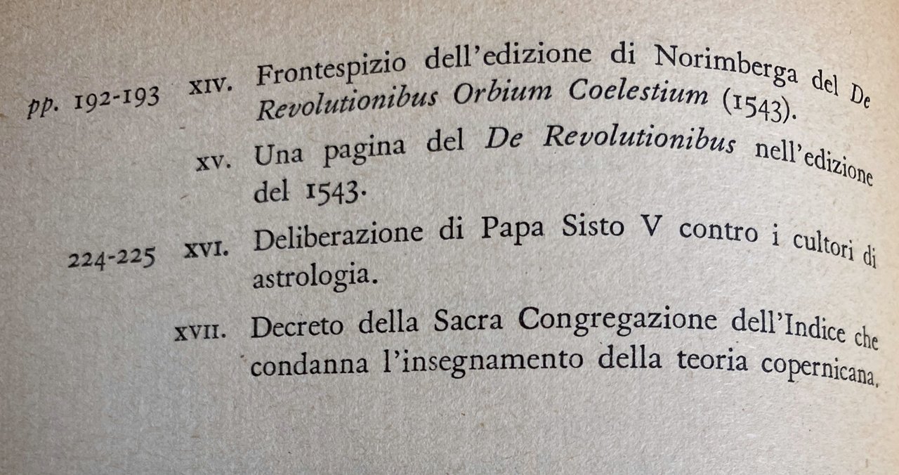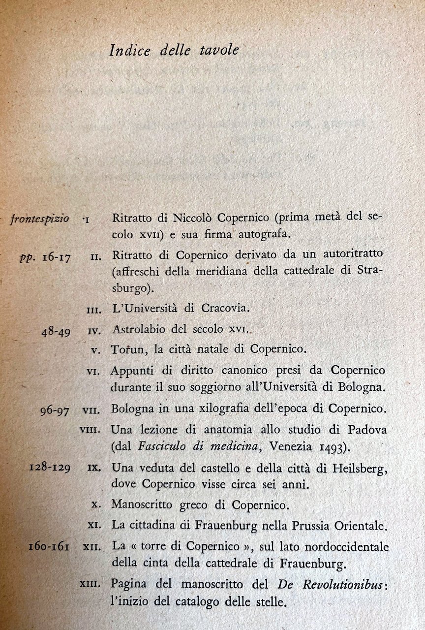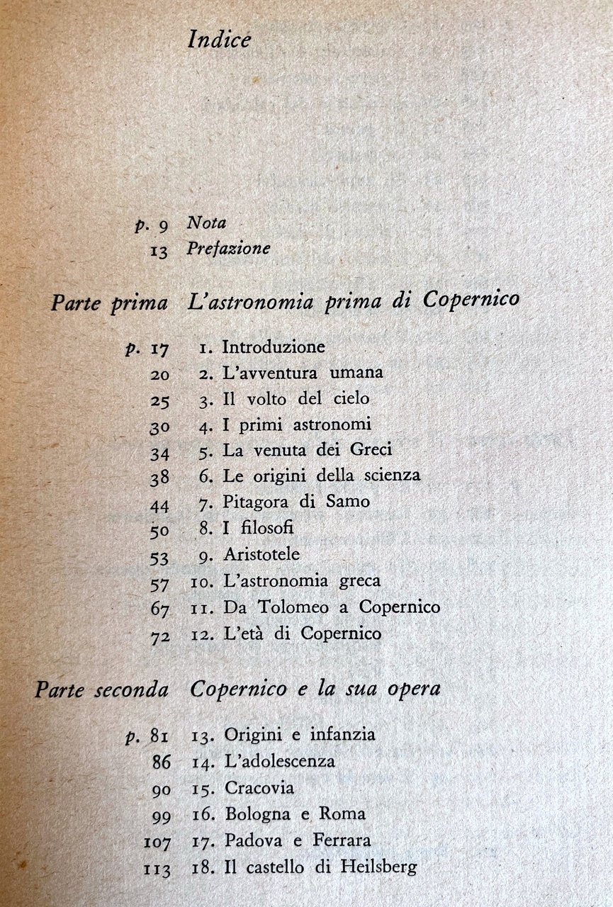 Soggetti: Biografie Memorie Astronomia Astronomi Greci Origini Scienza Cosmologia Pitagora di Samo Rivoluzione copernicana scientifica Fisica Filosofi Filosofia Aristotele Greca Tolomeo Opera Infanzia Adolescenza Cracovia Bologna Roma Padova Ferrara Castello Heilsberg Umanista Frauenburg Allenstein Osservatore Riforma Calendario Guerra Malattie Medico Retico Immortalità Rivoluzioni Prefazioni Scoperte Rotazione terrestre Gravità Movimento Terra Universo Teorie Inghilterra Infinito Pianeti Telescopio Vortice Gravitazione Meccanica universale Ritratto Firma autografa Autoritratto Affreschi Meridiana Cattedrale Strasburgo Università Astrolabio Tofun Appunti Diritto canonico Xilografia Lezione Anatomia Fasciculo Medicina Manoscritti Prussia Torre De Revolutionibus Frontespizio Norimberga Orbium Coelestium 1543 Deliberazione Papa Sisto V Astrologia Decreto Sacra Congregazione Indice Condanna Santa Inquisizione Chiesa Teologia Libri rari Vintage illustrati fuori catalogo Saggi biografici Bibliografia Riferimento Scritti Opere generali Ritratti Testimonianze Umanesimo Rinascimento Scienziati Pensiero moderno Almagesto Vescovo Canonici Cerchio Cartesio Distanza Ermland Europa Galileo Geometria Corpi celesti Cielo Idee Italia Giove Keplero Kulm Latino Luca Waczenrode Misura Luna Moto Natura Newton Osservazioni Orbita Filolao Planetaria Polonia Posizione Protestanti Tavole Prussiane Tramonto Sole Spazio Sfera Storia Cavalieri Teutonici Thomas Digges Tiedemann Torun Triangolo Tycho Brahe Wittenberg Lutero Progresso Angolo Apogeo Abside Linea Aristarco Babilonesi Celeste Moti circolari Commentariolo Sistema Diurno Dottrina Asse Est Eccentrico Eclittico Eclissi Epiciclo Equatore Punti equinoziali Equinozio Eudosso Stelle fisse Geocentrismo Teoria Eliocentrica Ipparco Ipotesi Illustrazioni Inclinazione Koppernigk Latitudine Longitudine Matematica Mercurio Oscillazione Parallasse Fenomeni Polo Saturno Periodo siderale Sinodico Venere Ovest Aberrazione Luce Commentariolus Coper Narratio prima Precessione Testi Collezionismo Marte Albert Brudzewski Domenico Maria Novara Georg von Peuerbach Zinner Kesten Prowe Dreyer Duhem Bruchnalski Rajkov Berti Brozek Kopernikowska 1509-1923 Biographies Memoirs Astronomy Greek Astronomers Origins Science Cosmology Pythagoras Scientific Copernican Revolution Physics Philosophers Philosophy Aristotle Ptolemy Krakow Rome Padua Reformation Calendar War Diseases Immortality Revolutions Discoveries Earth's Rotation Gravity Movement Universe Theories England Infinity Planets Telescope Vortex Gravitation Universal Mechanics Portrait Autograph Signature Self-Portrait Frescoes Sundial Cathedral Strasbourg University Astrolabe Notes Canon Law Woodcut Lecture Anatomy Medicine Manuscripts Tower Frontispiece Nuremberg Deliberation Pope Sixtus V Astrology Decree Sacred Congregation Index Condemnation Holy Inquisition Church Theology Rare illustrated books out of stock Biographical essays Bibliography Reference Writings Portraits Testimonies Humanism Renaissance Scientists Modern thought Bishop Canons Circle Descartes Distance Europe Geometry Celestial bodies Sky Ideas Italy Jupiter Measure Moon Motion Nature Observations Philolaus Planetary Poland Position Protestants Prussian Tables Sunset Space Sphere History Teutonic Knights Luther Triangle Progress Angle Apogee Apse Line Aristarchus Babylonians Circular Motions Commentary Diurnal System Doctrine East Axis Eccentric Ecliptic Eclipse Epicycle Equator Equinoctial Points Equinox Eudoxus Fixed Stars Geocentrism Heliocentric Theory Hipparchus Hypothesis Illustrations Inclination Latitude Longitude Mathematics Mercury Oscillation Parallax Phenomena Pole Saturn Sidereal Period Synodic Venus West Aberration Light Precession Texts Collectibles