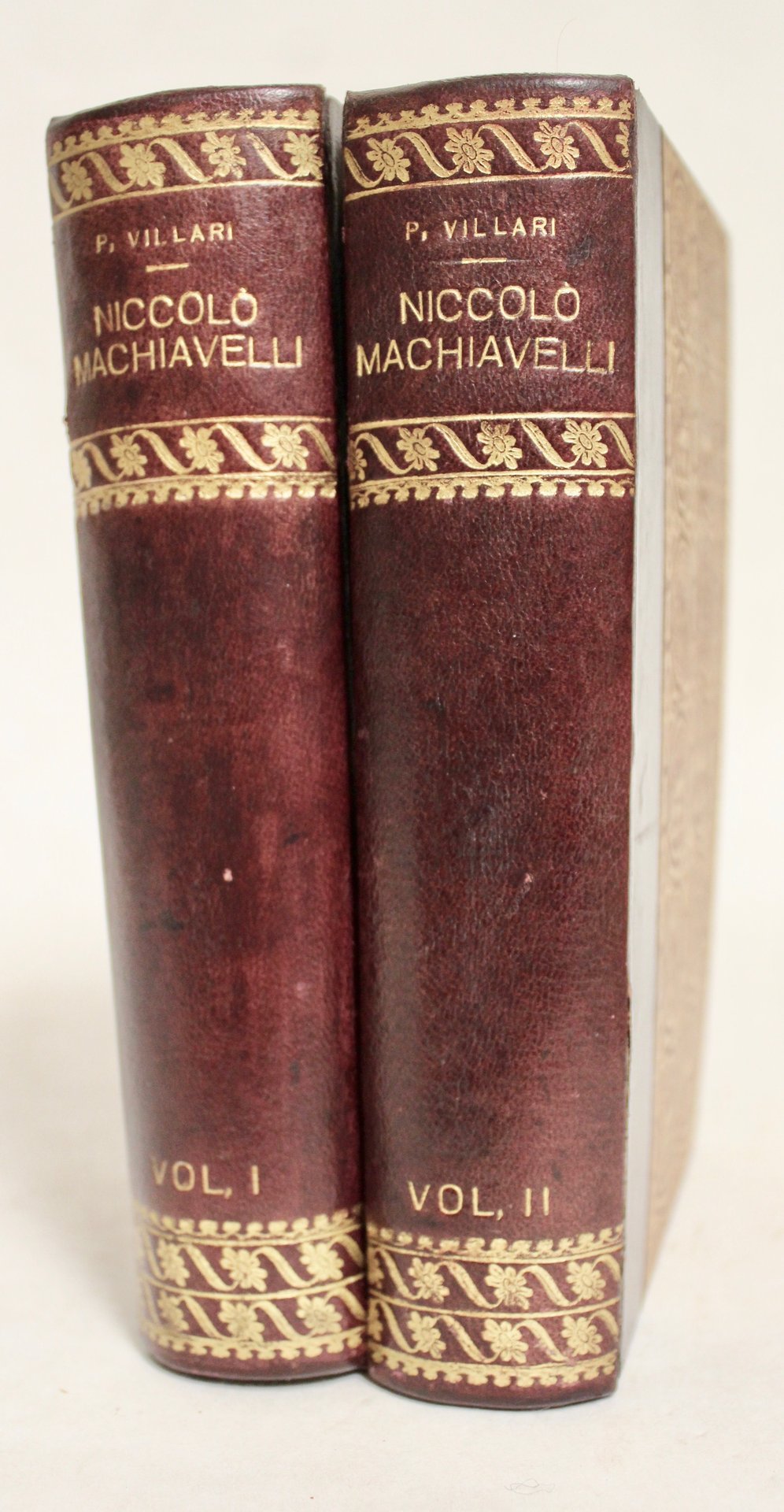 2 voll. In 8°; pagg. XVI, 681; 683. Una foto della statua di Macchiavelli in antiporta, frontespizio in rosso e nero. Mezza pelle coeva con titolo e fregi impressi in oro al dorso. Buon esemplare.