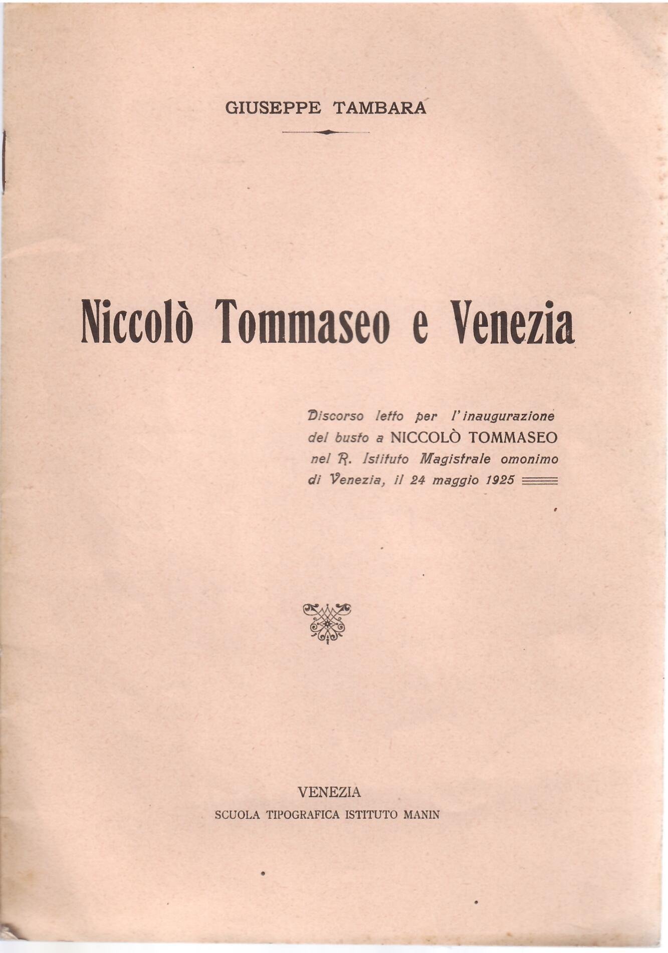 - DISCORSO LETTO PER L'INAUGURAZIONE DEL BUSTO A NICCOLO' TOMMASEO NEL R. ISTITUTO MAGISTRALE - VENEZI 24 MAGGIO 1925