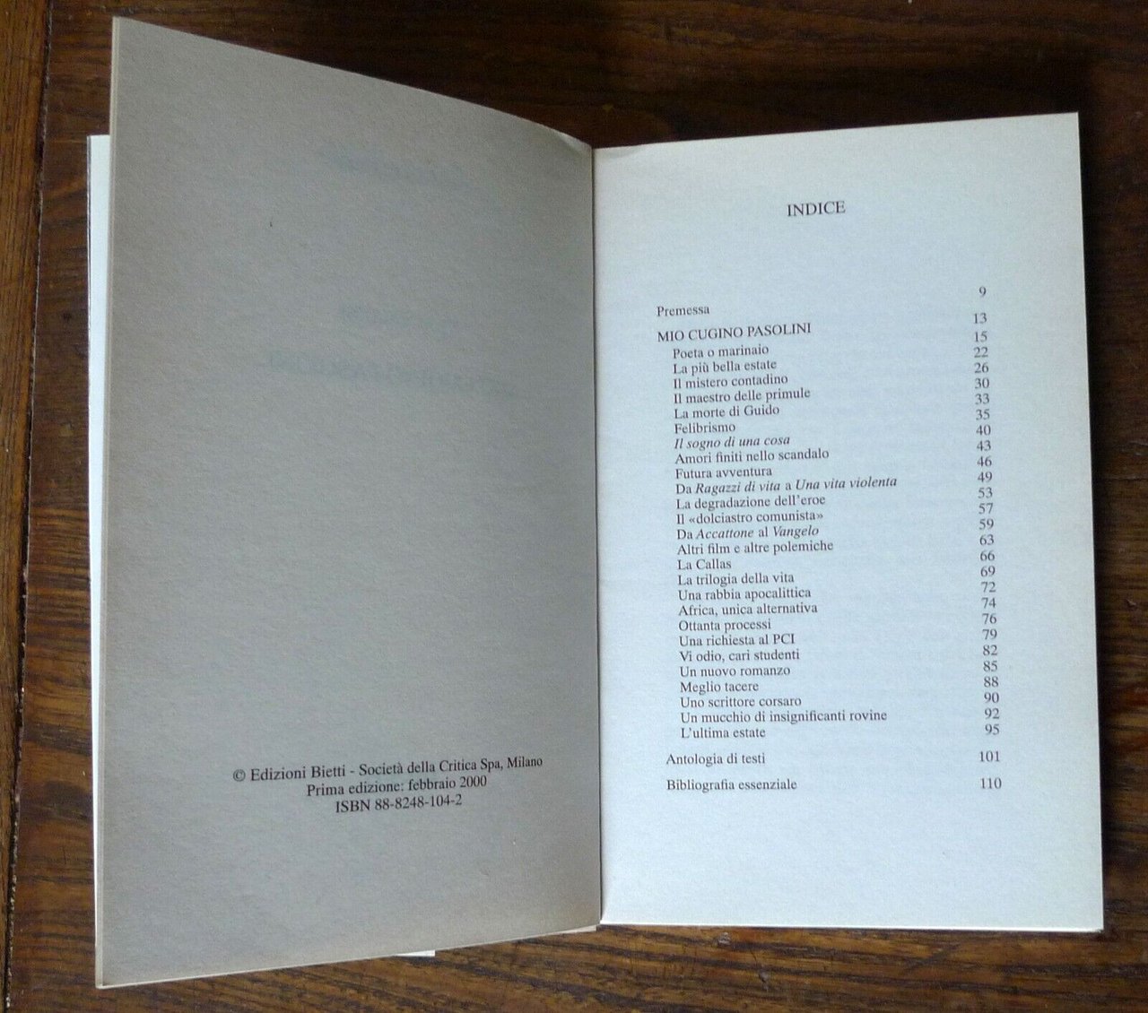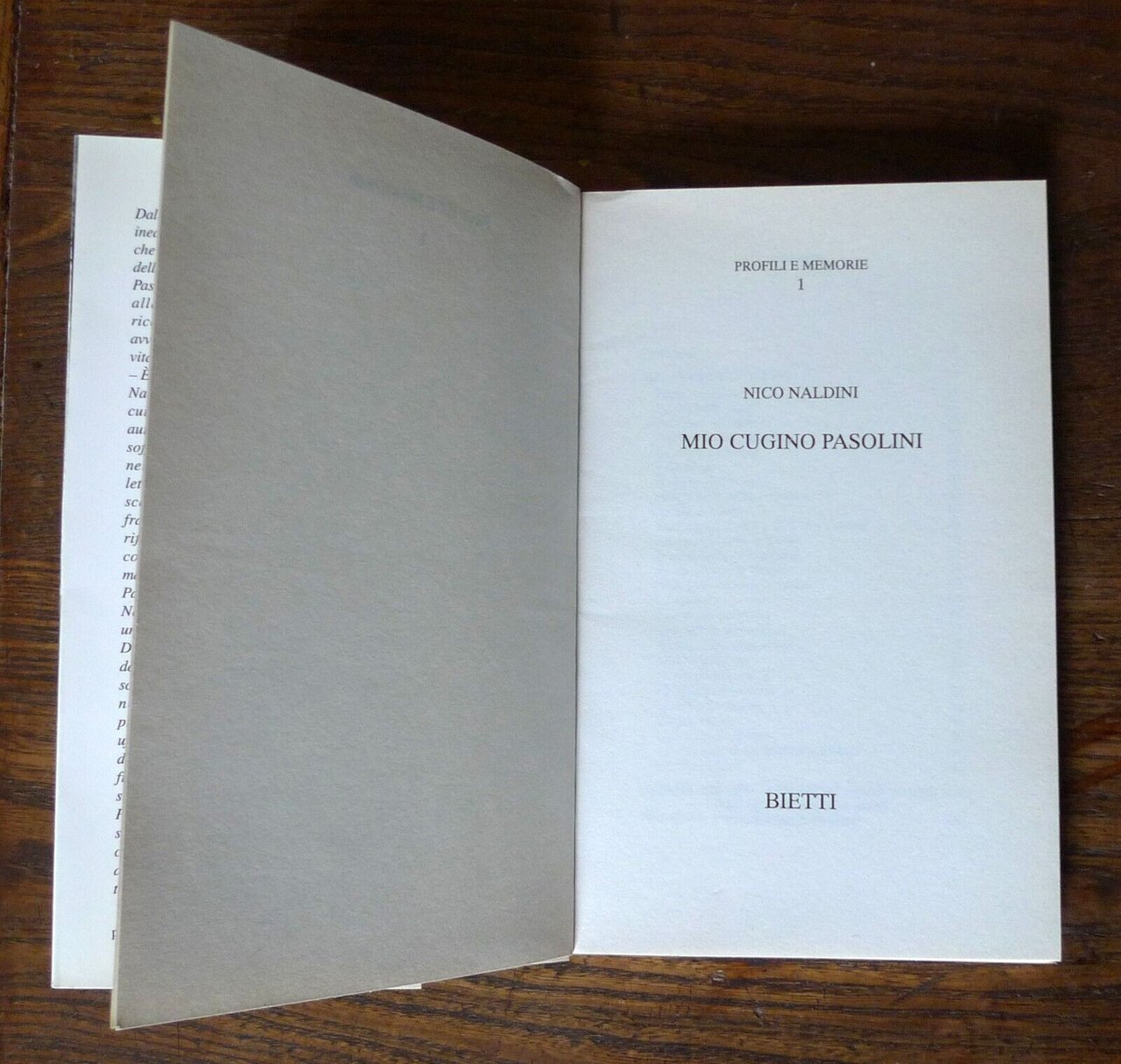 Nico Naldini,MIO CUGINO PASOLINI.Edizioni Bietti, Milano 2000,prima edizione: febbraio 2000,brossura, 20x12 cm., pp.111,collana PROFILI E MEMORIE n.1,ISBN: 88-8248-104-2,peso: g.200
