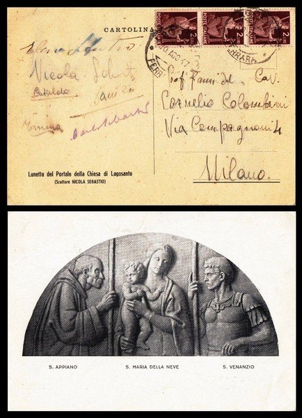 cartolina firmata di Nicola Sebastaio riproducente al verso la sua opera "Luneta del Portale della Chiesa di Lagosanto"; buon es.