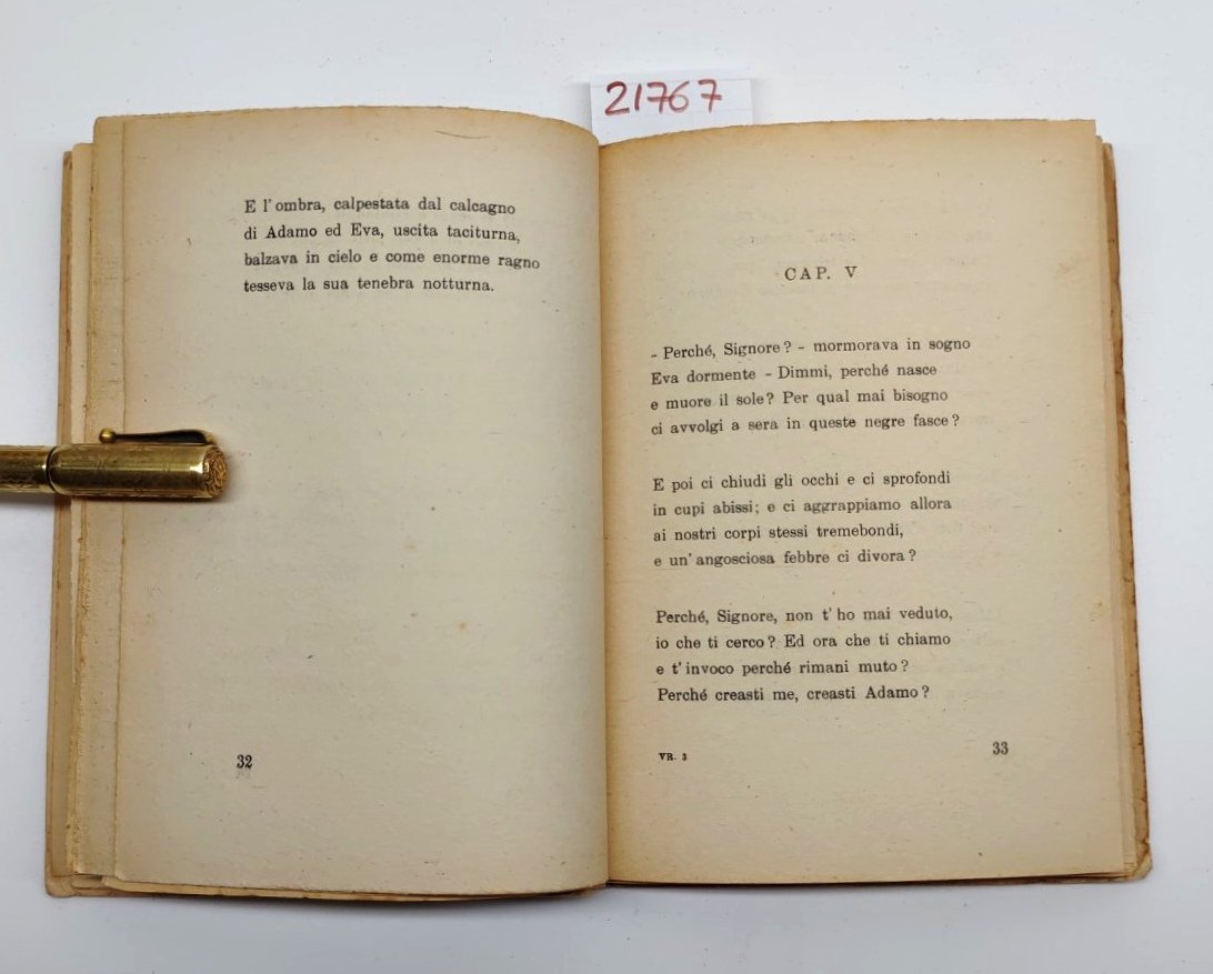 Legatura morbida editoriale leggermente brunita con i piedi aloni ai piatti, dorso brunito con le piccole abrasioni ai margini, tagli irregolari bruniti, alcune fioriture le pagine interne maggiormente presenti le prime ed ultime pagine, lievissima brunitura al margine esterna delle pagine, numero pagine 130 + 15 dimensioni cm 18,3 * 13,2
