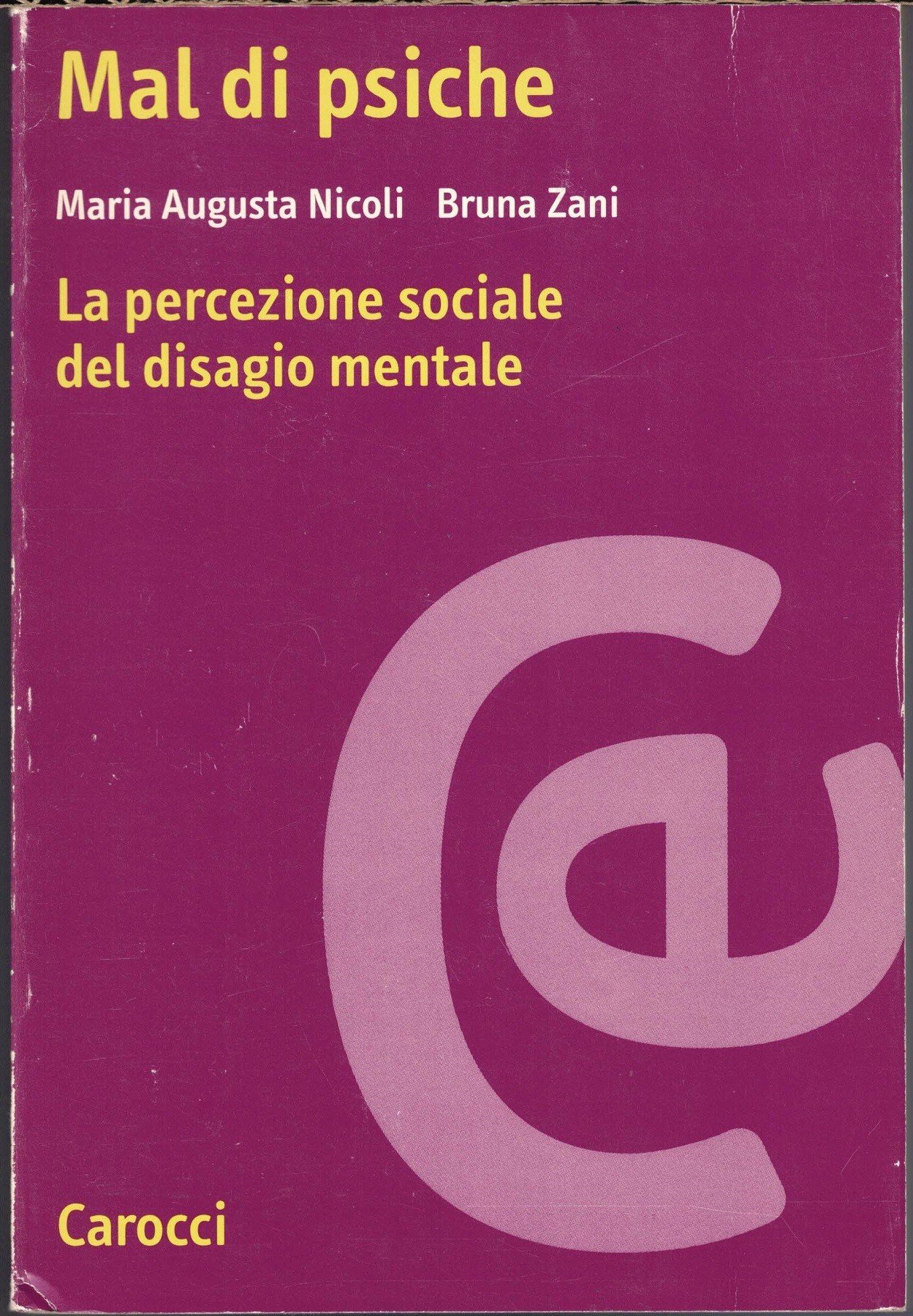 Maria Augusta Nicoli, Bruna Zani, Mal di psiche. La percezione sociale del disagio mentale, Carocci editore, Roma 1998, prima ed., pp. 229, ill. b.n., cm 22, br. ed. Collana Ricerche, vol. 26. Serie Psicologia. Leggere tracce d’uso, minima brunitura della carta, per il resto ben conservato.