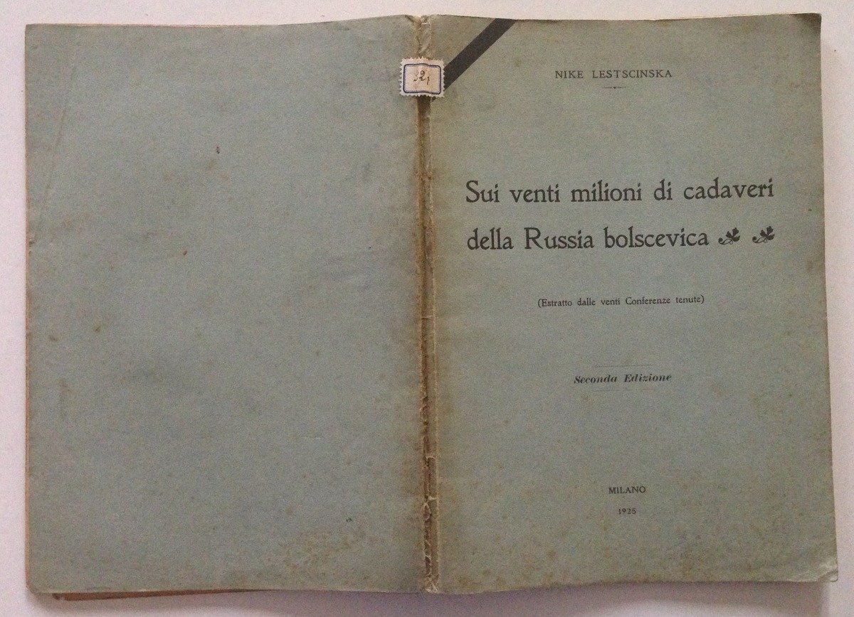 Nike Lestscinska, Sui venti milioni di cadaveri della Russia bolscevica Milano, 1925; cm. 24.5x17, pp. 114; pecetto edit. al dorso; nome ex proprietario alla prima bianca; br. ed., seconda ed. Condizioni di conservazione Esemplare in buono stato con leggere tracce d'uso e del tempo e con bruniture; brossura editoriale con minime pieghette; dorso con minimi strappetti. SETT142.L14202 MT