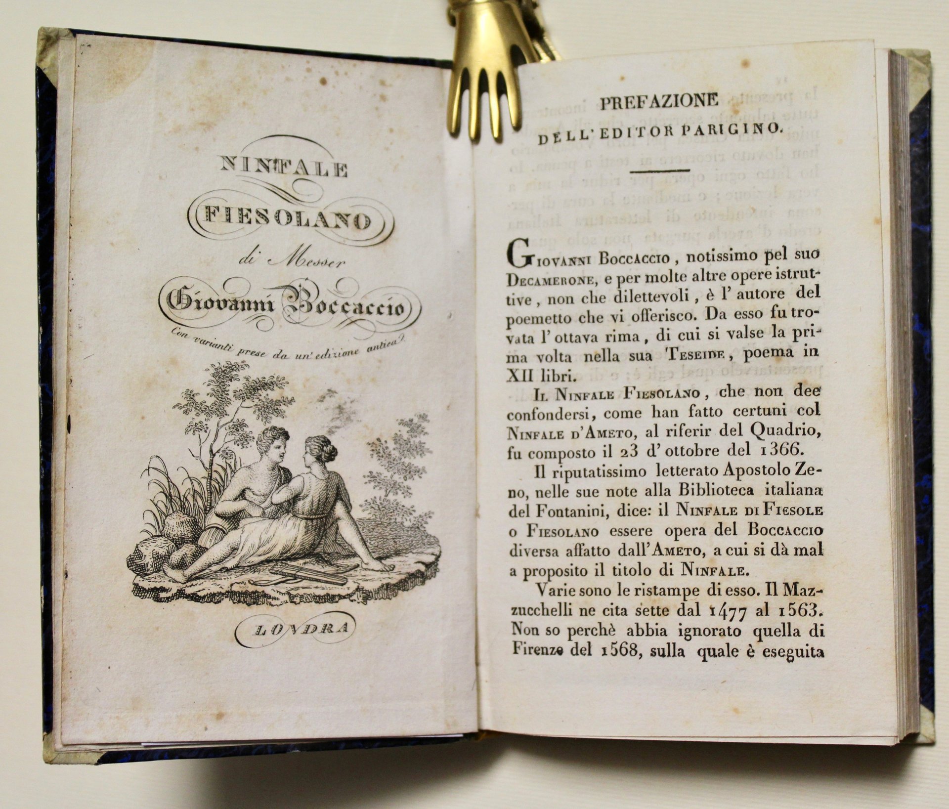 In 12° (mm 140x85); pagg. XXIV, 5-123, (1). Occhietto, vignetta calcografica al frontespizio, curiosamente montato a rovescio. A cura di Stefano Audin. Nonostante la paginazione in cifre arabe cominci da 5 la collazione dei fascicoli risulta completa. Mezzo marocchino verde con titolo ed eleganti fregi in oro al dorso, piatti marezzati blu con piccoli angoli in pergamena. Il Ninfale fiesolano è un'opera, che si suppone sia stata composta attorno al 1345. Il poemetto è strutturato in ottave di endecasillabi. Il sapore e il contesto del componimento sono mitologici, ma il filo conduttore della trama rimane sempre quello amoroso. Bell'esemplare. Minime fioriture. Alcune note di possesso antiche al contropiatto.