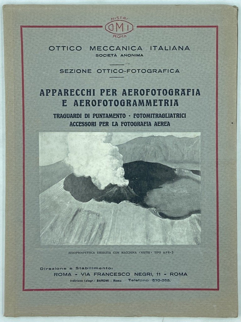 Brossura editoriale in cartoncino corrugato grigio con titoli in nero, cornice rossa e fotografia applicata, legatura a punto metallico, cm 28.5 x 22, pp 88 (8) illustrate in nero, testo riquadrato in cornice verde. Piccolo difetto d'aderenza sul margine delle pagine 12 e 13, senza perdita di testo o immagini, peraltro molto ben conservato. Bel catalogo di strumenti fotografici e ottici dell'azienda fondata dall'aviatore Umberto Nistri. Il catalogo presenta, con immagini degli apparecchi, schemi tecnici e esempi dei risultati ottenuti, alcune fotocamere a lastra e pellicola per aero-fotografia e aerofotogrammetria, relativi accessori, macchine fotocartografiche, fototeodoliti, apparecchi per l'addestramento alla caccia aerea e dei mitraglieri (fotomitragliatrici), apparecchi di puntamento per bombardieri e relativo addestramento, strumenti di stampa e camera oscura; in calce al fascicolo sono presenti 4 carte non numerate con cenni ad altre produzioni OMI, in particolare agli strumenti per l'aeronavigazione utilizzati sugli S 55-X della Crociera Aerea del Decennale (con immagini dello strumento e del posto di pilotaggio).