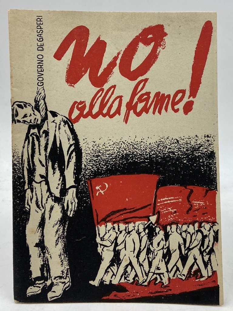 Brossura editoriale illustrata, cm 17 x 12, pp 32 stampate in nero e rosso, con numerose illustrazioni. Opuscolo di propaganda del Partito Comunista Italiano contro il governo democristiano di De Gasperi sui temi della disoccupazione, del caro-vita, del Piano Marshall, ecc. Molto illustrato, in copertina campeggia un uomo impiccato da un cappio con la dicitura «Governo De Gasperi», con un corteo sventolante bandiere rosse sullo sfondo.