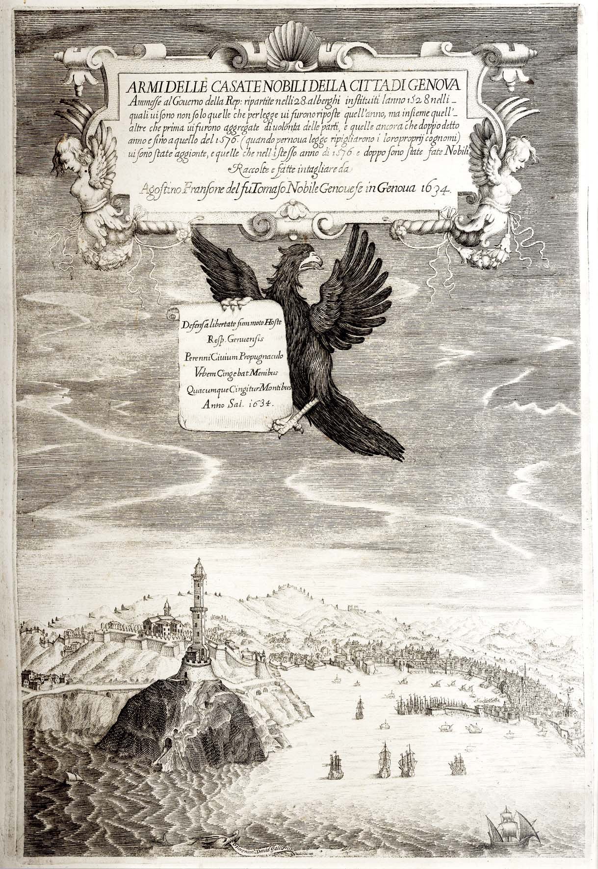 >in-folio (cm.48x36) 36 tavole incise in rame, 4 ff. nn. in fine di indici. Legatura coeva in cartone con carta marmorizzata, dorso in pergamena. L'opera si compone di 6 tavole n.n., ovvero: ritratto dell' autore entro medaglione con nastri e fogliami, antiporta a mo' di frontespizio con armi e parti di armature, tavola dedicatoria entro cornice architettonica, frontespizio con titoli su cartiglio in bordura e bella veduta della città di Genova dal mare, armi della città di Genova, San Giorgio che uccide il Drago; 31 magnifiche tavole numerate (due volte la uno e II-XXIX), di ricchi blasoni nobiliari. Prima edizione, sontuosa e rarissima, sapientemente illustrata da Jerome David e dedicata al principe Doria, il cui stemma compare al frontespizio. Le tavole raffigurano le armi araldiche delle famiglie nobili genovesi ''ammesse al Governo della Repubblica e ripartite nelli ventotto Alberghi'' istituiti nel 1528, integrate da ''quell'altre che prima vi furono aggregate di volontà delle parti e quelle ancora che dopo detto anno e sino a quello del 1576... vi sono state aggiunte, e quelle che nell'istesso anno 1576 e dopo sono state fatte Nobili''. Ottimo esemplare di una delle più belle opere su Genova; grande di margini, (con poche lievi fioriture). Manno VI, 25222. Cicognara 2032. Spreti 1579. Colaneri 724.