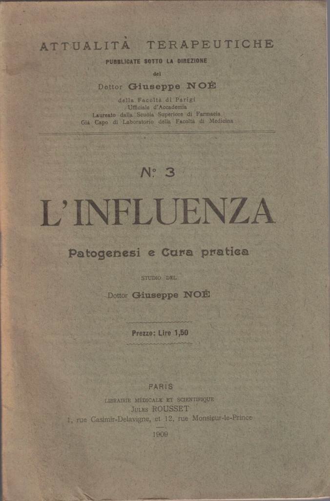 L’influenza. Patogenesi e cura pratica, studio del Dottor Giuseppe Noé, Librairie Médicale et Scientifique Jules Rousset, Paris 1909, pp. 55, cm 24, rilegatura ed. a punto metallico. Collana Attualità terapeutiche, n. 3. Minime tracce d’uso, lievissima brunitura della carta, per il resto ottimo esemplare.