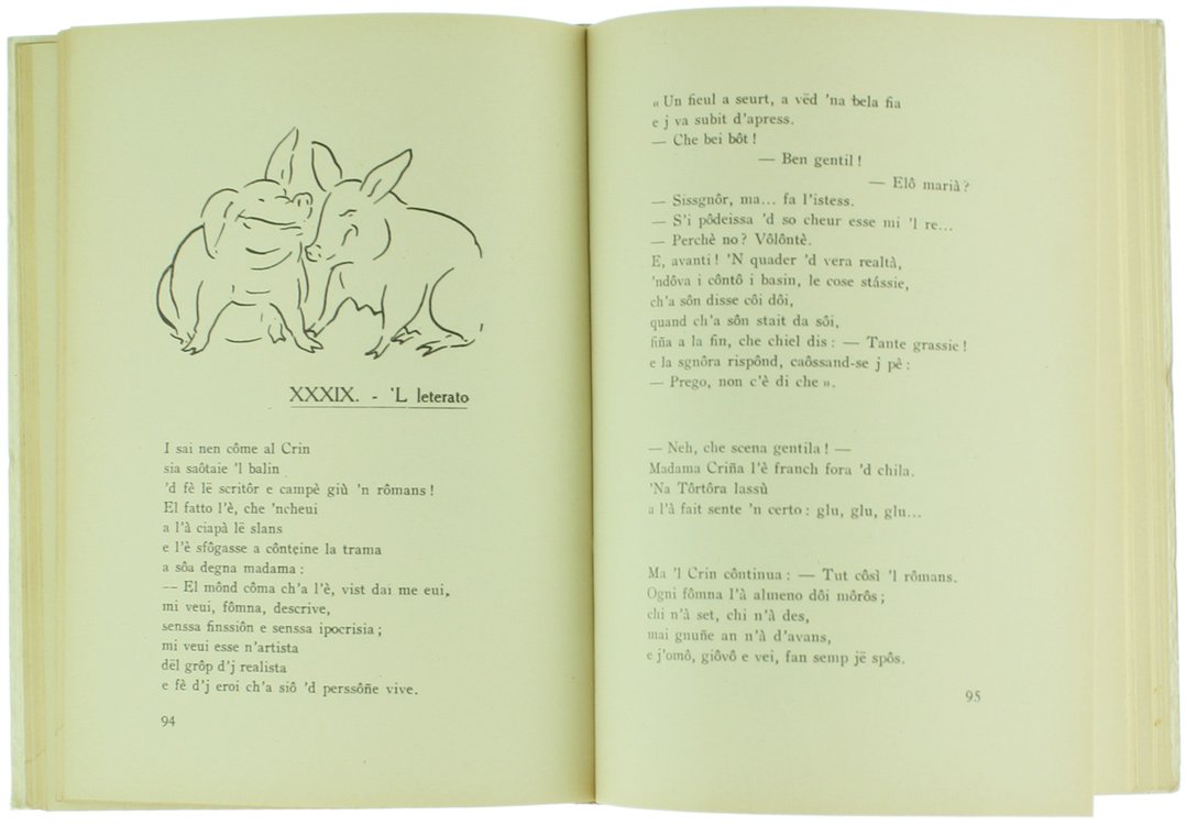 (Codice LO/6458) In 8° (21,5 cm) IV-162 pp. Poesie poesie piemontesi, edizione ampliata. Bella carta forte avoroio. Illustrato con numerosi disegni di Felice Vellan (figure di animali). Premessa di Azelia Arici. Brossura editoriale. Ottimo. ~~~ SPEDIZIONE IN ITALIA SEMPRE TRACCIATA