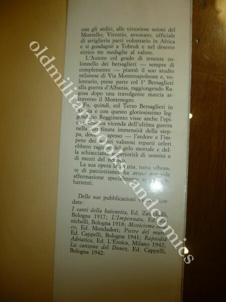 DESCRIZIONE: Schena Editore Fasano di Puglia 1968, br. ed. con sovracc. ill. col. con alette, pp. 434con foto, cartine e disegni in 8°. L'epopea in terra di Russia di uno dei piu' famosi ed eroici Rgt Bersaglieri il III°, narrata da uno dei suoi ufficiali. CONDIZIONI: Buone/Ottime, danni alla sovracc. e mancanza al retro, interni perfetti. PESO / WEIGHT: 921 gr. without package