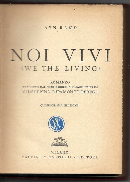 Libro vintage. Argomento: Romanzo. Autore: Rand Ayn. Editore: Baldini & Castoldi. Luogo: Milano. Anno: 1942. Formato: in-8°. Pagg: 471. Legatura: Cartonata in simil pelle. Collana:. Conservazione: Discreta. Prefazione e traduzione di Giuseppina Ripamonti Perego, quindicesima edizione. Lieve ingiallimento delle pagine. Piatto muto, titolo impresso in oro al dorso.