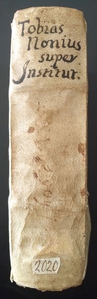 Venetiis, Dominicum Farreum, 1579. In 8vo, front. con piccolo cartiglio in alto e marca tip. in cornice figurata (la Carità con un bambino in braccio e altri tre attorno; in alto la scritta “Charitas”; motto: “Ubi charitas est, ibi Deus est”), cc. (24), pp. 310, leg. orig. in t. perg. floscia con laccetti (tre su quattro), nome dell’A. e tit. ms. al dorso. Thobia Nonius Perusinus (Perugia, 1528 - Perugia, 1570), fu giureconsulto e professore di diritto civile nell'Università di Perugia dal 1554. Nella “Perugia Augusta” di Cesare Crispolti (la più antica guida di Perugia, la cui prima edizione è del 1597) il Tobia viene menzionato, con Ranaldo Ridolfini, come “famosi & chiari dottori di Legge”. Tra le sue opere questa “Interpretationes in nonnullos Institutionum titulos”,la cui prima edizione è del 1568. Scorrendo l'indice, alla lettera M si trovano elencati alcuni paragrafi in cui si citano maledizioni, malefici, con l'indicazione della carta e il numero del paragrafo a numerazione postillata per meglio trovare gli argomenti nelle relative pagine. Nome di appartenenza al front., lievi sgualciture della pergamena e di alcune carte, esemplare peraltro fascinoso, fresco e ben conservato. Alcune gualciture alla pergamena ma buon esemplare fresco e genuino.