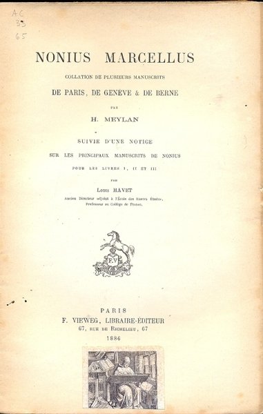 Nonius Marcellus. collation de plusieurs manuscrits de Paris, de Geneve e de Berne par H. Meylan. Suivie d'une notice sur les principaux manuscrits de nonius pour les livres I, II et III par Havet Louis.