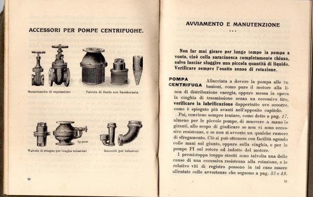 Ercole Marelli & C., Società Anonima, Milano, s.d. (1930 circa). In 12esimo, pp. 62, figure, disegni e incisioni in b/n n. t. di pompe ed elettropompe, bross. edit. in cartoncino grigio con fogli di guardia in carta grigia, titoli in nero. Piccoli difetti della bross. e sciupato il margine superiore e l'angolo superiore destro ma solo alla copertina, ottimo e praticamente allo stato di nuovo tuttol'interno.