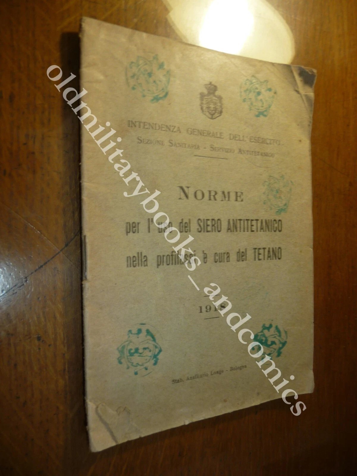 DESCRIZIONE: Intendenza generale dell'esercito, sezione sanitaria Stab. ausiliario Longo Bologna 1918 I^ Ed. br. ed. pp. 32 in 16°.