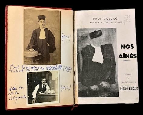 In 8°; 105, (3) pp, Lagatura artigianale in piena pelle rossa con titolo e autore impresso in oro al piatti anteriore entro cornice in filetto d'oro. Qualche strofinatura e difetto. Numerose foto applicate all'interno scattate dal 1898 al 1912 che ripercorrono la carriera di Paul Beneducci (amico dell'autore Colucci) che fu Presidente del tribunale d'Alessandria. Le foto ritraggono Beneducci nella sua carriera da studente di diritto all'Università di Toulouse, attraverso il suo passaggio al tribunale di Alessandria d'Egitto nel 1900, fino alla sua carica di giudice del tribunale d'Alessandria d'Egitto nel 1920. Lunga dedica manoscritta di Colucci in italiano, datata 1958. All'ultima pagina presente una nota manoscritta datata anni 50 con un'immagine di Giovanni Bolognini in fotocopia che fu governatore della Scuola Militare di Abrizal nel 1824, Cavaliere della Legione d'Onore, appartenente alle truppe napoleoniche, Istruttore delle forze armate egiziane e avo di Beneducci. L'opera ricostruisce la storia dell'avvocatura e dei membri del tribunale d'Alessandria tra l'inizio del XX° secolo e gli anni 40° del novecento in uno dei momenti più problematici dell'Egitto nel quale molteplici nazioni si dividevano il controllo amministrativo del territorio. Opera rarissima, nessun esemplare reperito in nessuno dei repertori consultati, impreziosita dalle 7 fotografie d'opera.