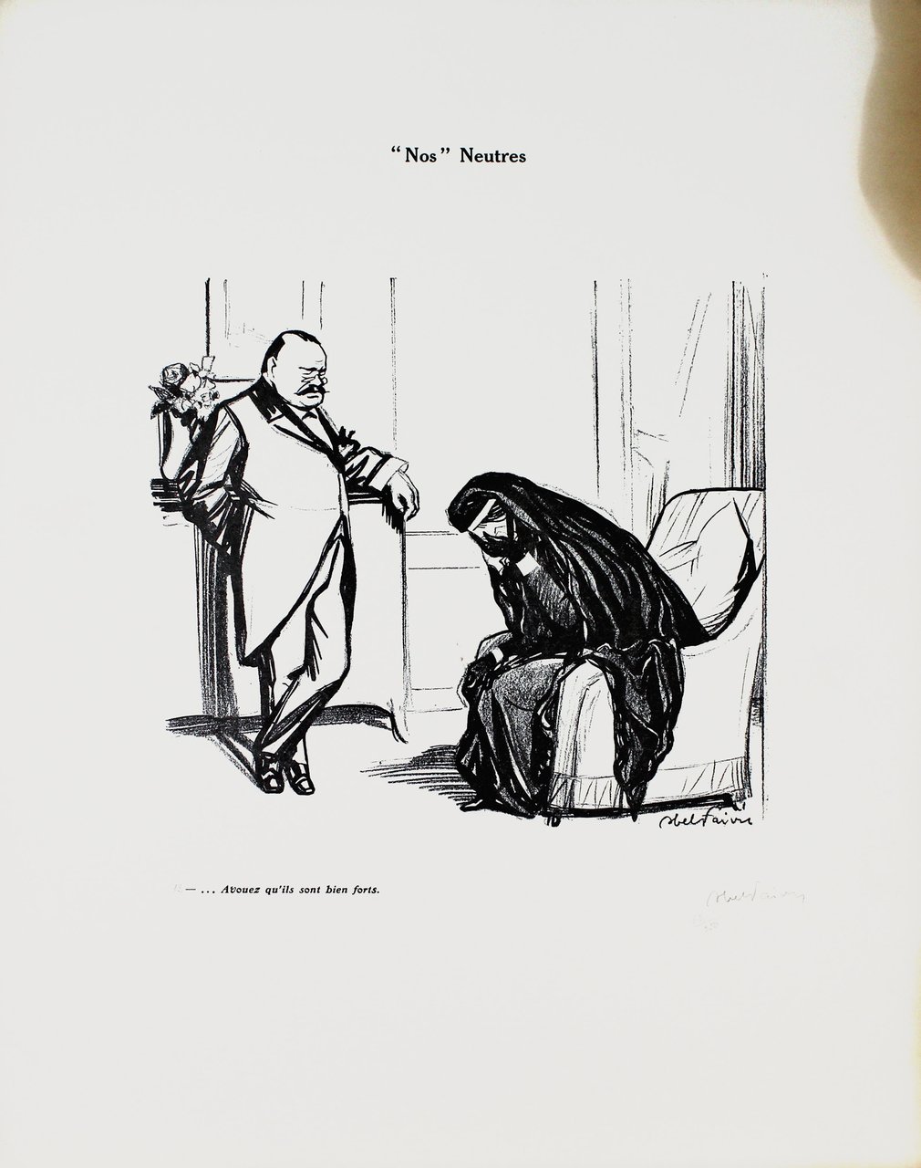 Abel Jules Faivre (Lione 1867 - Nizza 1945) Litografia originale firmata a mano dall'artista.Dimensioni: 56 x 38,5 cmCon certificato di autenticità C.O.A.Ingiallimento laterale come da foto.Esemplare numero 62/250 La raccolta di litografie umoristiche del caricaturista francese Abel Faivre (Lione 1867-Nizza 1945), andata a confluire nel volume Jours de guerre,fu pubblicata in due tomi tra il 1915 e il 1919. Con il procedere del conflitto, l'opinione pubblica di tutti i paesi coinvolti,che aveva dapprima affrontato tale evento con ottimismo, mutò rapidamente opinione sino a considerare la guerra, senza mezzi termini,come un avvenimento rovinoso. In tale contesto, le vignette satiriche di guerra possedevano un potente effetto catartico,adempivano un ruolo sociale irrinunciabile, fornendo una valvola di sfogo all’incombere dal più cupo pessimismo. Abel Jules Faivre (Lyon 1867 - Nizza 1945) Originale Lithographie vom Künstler von Hand signiert.Abmessungen: 56 x 38,5 cmMit Echtheitszertifikat C.O.A.Seitliche Vergilbung wie auf dem Foto.Kopieren Sie die Nummer 62/250 Die Sammlung humorvoller Lithographien des französischen Karikaturisten Abel Faivre (Lyon 1867-Nizza 1945), die in den Band Jours de guerre floss,es wurde zwischen 1915 und 1919 in zwei Bänden veröffentlicht. Im Verlauf des Konflikts wurde die öffentliche Meinung in allen beteiligten LändernWer dieses Ereignis anfangs mit Optimismus konfrontiert hatte, änderte schnell seine Meinung, um den Krieg ohne Zweifel zu betrachten.wie ein ruinöses Ereignis. In diesem Zusammenhang hatten die satirischen Kriegskarikaturen eine starke kathartische Wirkung.Sie erfüllten eine unverzichtbare soziale Rolle und bildeten ein Entlastungsventil gegen den dunkelsten Pessimismus. Abel Jules Faivre (Lyon 1867 - Nice 1945) Lithographie originale signée à la main par l'artiste.Dimensions: 56 x 38,5 cmAvec certificat d'authenticité C.O.A.Jaunissement latéral comme sur la photo.Copie numéro 62/250 La collection de lithographies humoristiques du caricaturiste français Abel Faivre (Lyon 1867-Nice 1945), qui allait se fondre dans le volume Jours de guerre,il a été publié en deux volumes entre 1915 et 1919. À mesure que le conflit progressait, l'opinion publique de tous les pays impliqués,qui avait d'abord fait face à cet événement avec optimisme, a rapidement changé d'avis pour envisager la guerre, en termes non équivoques,comme un événement ruineux. Dans ce contexte, les caricatures de guerre satiriques ont eu un puissant effet cathartique,ils remplissaient un rôle social indispensable, fournissant une soupape de décharge du pessimisme le plus sombre. Abel Jules Faivre (Lyon 1867 - Nice 1945) Original lithograph signed by hand by the artist.Dimensions: 56 x 38.5 cmWith certificate of authenticity C.O.A.Lateral yellowing as in the photo.Copy number 62/250 The collection of humorous lithographs by the French caricaturist Abel Faivre (Lyon 1867-Nice 1945), which went to flow into the volume Jours de guerre,it was published in two volumes between 1915 and 1919. As the conflict progressed, public opinion in all the countries involved,who had initially faced this event with optimism, quickly changed his opinion to consider the war, in no uncertain terms,like a ruinous event. In this context, the satirical war cartoons had a powerful cathartic effect,they fulfilled an indispensable social role, providing a relief valve from the darkest pessimism.