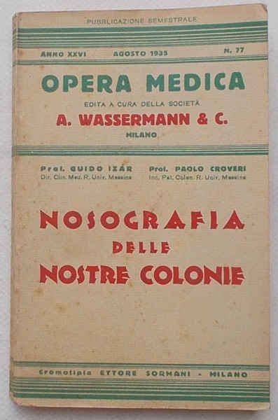 In 16° (cm. 17,5 x 11); pagg. III, 292; con 1 cartina n.t.; leggera cartonatura originale. VG. ** Climatologia e nosografismo delle nostre colonie e esame delle diverse malattie: malaria, amebiasi, lebbra, beriberi, tifo tropicale da zecche.