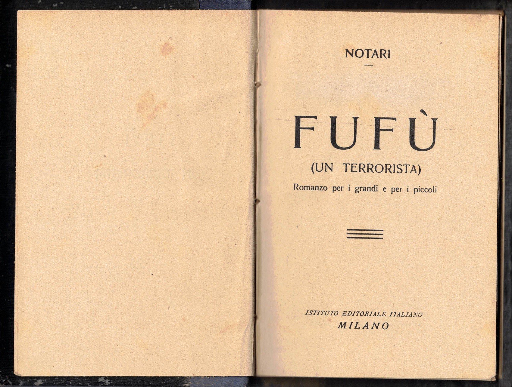 Notari (Umberto Notari), Fufù. (Un terrorista). Romanzo per i grandi e per i piccoli, Istituto Editoriale Italiano, Milano s.d. (ma 19.), pp. 105, cm 20, legatura in mezza tela con prima di copertina originale applicata al piatto anteriore. Minime fioriture, leggera brunitura della carta, per il resto buon esemplare.