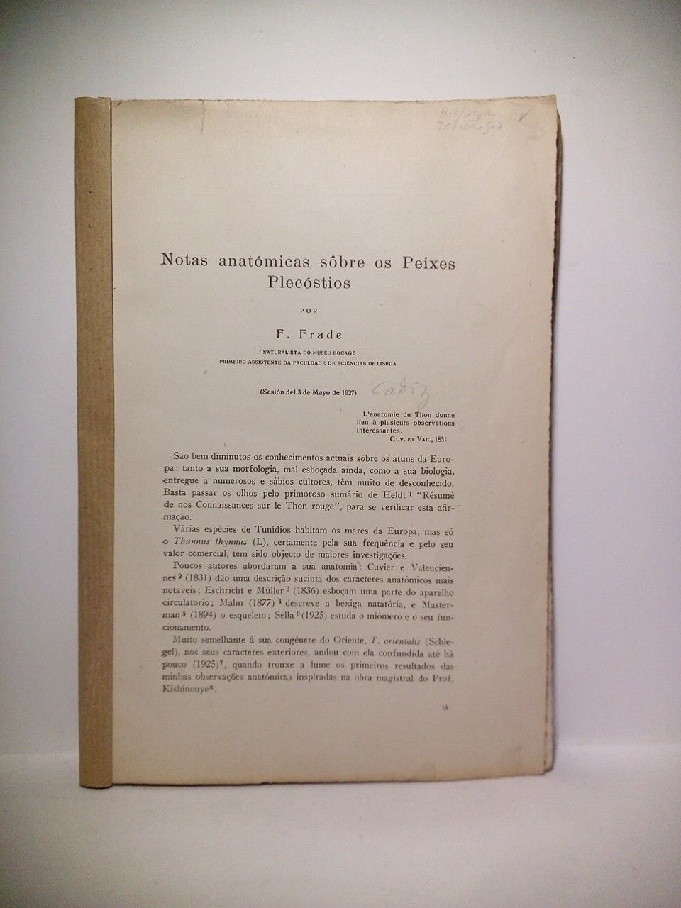 [Madrid]: Asoc. Esp. para el Progreso de las Ciencias, [ca. 1931].- P. 209-215 (en total 7 pags.): Ilustraciones entre el texto; 4º (24,8 x 17,8 cm); Texto en portugués; Cubiertas provisionales.- Desglosado del Boletín de la "Asociación Española para el Progreso de las Ciencias". Congr. de Cádiz, Sec. 4, Ciencias Naturales. Madrid, 1931?.* Al tratarse de un desglose carece de cubiertas y se le han puesto unas provisionales en papel. ICTIOLOGÍA E HIDROBIOLOGÍA EN GENERAL