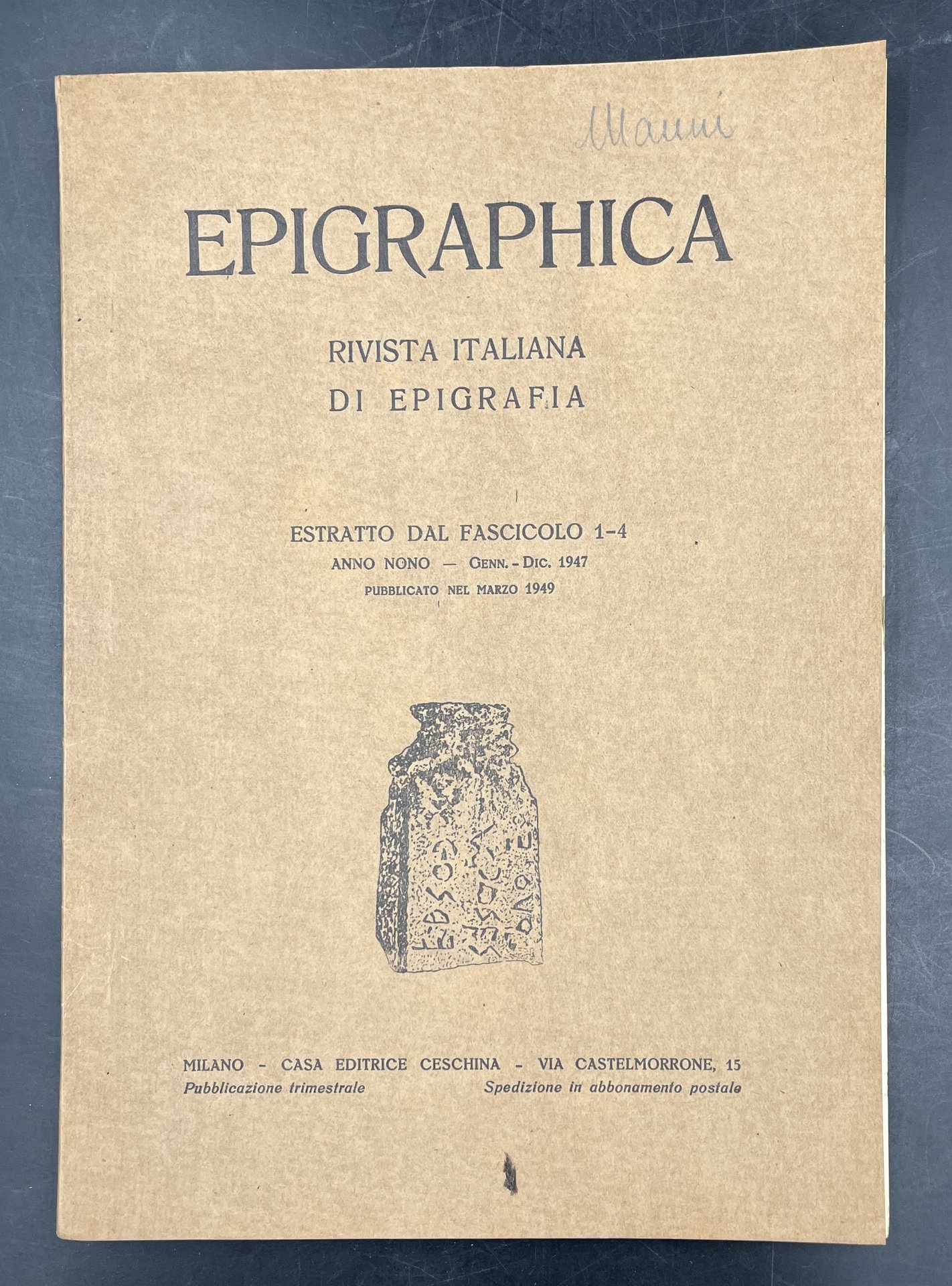Note di EPIGRAFIA GALLIENIANA. Estr. orig. da: Epigraphica, 9 (1947), fasc. 1-4. [Su GALLIENO].