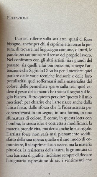 L'artista riflette sulla sua arte, quasi ci fosse bisogno, anche per chi si esprime attraverso la pittura, di trovare nel linguaggio comune, di tutti, le parole per comunicare il senso del proprio lavoro. Nel confronto con gli altri artisti, sia i grandi del passato, sia quelli a lui più prossimi, emerge l'attenzione che Sigfrido Oliva ha per il mestiere: quel parlare delle varie tecniche incisorie e delle loro peculiarità; quel soffermarsi sulla materialità del colore, delle pennellate sparse sulla tela; quel vedere il gesto della mano che traccia il segno sul foglio bianco. Tutto questo per dire: questo è il mio mestiere; per chiarire che l'arte nasce anche dalla fatica fisica, dallo sforzo che fa l'idea astratta per concretizzarsi in un segno, in una forma, in una sfumatura di colore. E come, in questa lotta con l'ombra, la stessa idea è costretta a modificarsi, la materia prende vita, ma detta anche le sue regole. L'artista forse non sarà mai pienamente soddisfatto della sua opera: quello è il suo modo di comunicare, lì si esprime il suo essere, ma la materia pittorica, la resistenza della lastra, la grumosità di una barretta di grafite, rischiano sempre di deviare l'originaria espressione di sé, i sentimenti che muovono il gesto, le emozioni che spingono l'artista al suo lavoro (.)