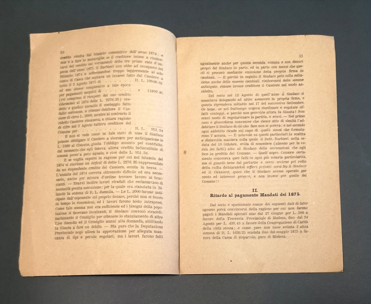 >in-8, pp. 28, broch. edit. Edizione originale di questo opuscolo politico, scritto dal sindaco del Comune di San Prospero (provincia di Modena) e diretto ai suoi concittadini ed elettori, per replicare alle vertenze di consiglieri comunali dimissionari riguardo alle sue mancanze alla guida del paese. Raro. Perfetto esemplare.