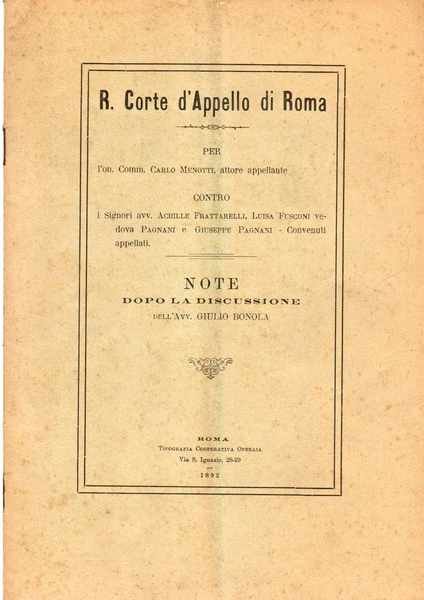 Note dopo la discussione dell'Avv. Giulio Bonola - R. Corte d'Appello di Roma per l'On. Comm. Carlo Menotti attore appellante contro i Signori Avv. Achille Frattarelli, Luisa Fusconi Ved. Pagnani e Giuseppe Pagnani convenuti appellanti