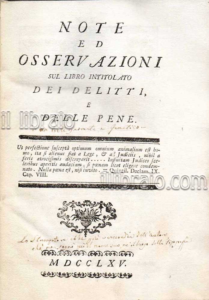 in 16°; pp. (2), 191, (3); br. cartonato rustico coevo; 1^ ed. Testatina e finalino entrambi xilografici. Ultima pagina con "errata corrige". Rara edizione originale di questa che viene considerata come la più radicale e dura confutazione delle tesi pubblicate nell'opera del Beccaria "Dei delitti e delle pene" (1764). Facchinei, monaco vallombrosano, che precedentemente si era visto rifiutare dagli inquisitori il permesso per la pubblicazione di brevi note poste a piè di pagina al libro del Beccaria, scrisse e pubblicò nei primi mesi del 1765 quest'opera senza indicare il luogo di stampa (ma Venezia, Zatta). L'autore scrisse questo saggio con tono iroso e risentito, Beccaria stesso è descritto come uno stupido impostore, sfacciato, indegno e via dicendo. Con profonde implicazioni per la filosofia, la politica e l'economia, il libro contiene uno dei primi esempi stampati del termine "socialista" (che per lui indica un teorico delle idee di contratto sociale, eguaglianza e libertà) e un primo riferimento al concetto di "mano invisibile". Il libro rappresenta il rifiuto più radicale delle idee del giurista, comprese quelle relative alla pena capitale e alla tortura, alla teoria del contratto, alla libertà politica e all'egualitarismo. (Condizioni molto buone: rare annotazioni a margine, di antica mano, molto polemiche nei confronti di questo saggio e dell'autore che definisce, senza mezzi termini, "forte ignorante e fanatico")