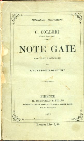 In-8° piccolo, pp. XVI, 295, cartonatura moderna decorata in bianco su fondo rosso. Titolo in oro su tassello in pelle rossa al dorso. Brossura originale conservata. Buon esemplare. Prima edizione, pubblicata postuma dal Rigutini, delle pagine sparse collodiane. Biblioteca Ricreativa. Pagliaini, II, p. 511.