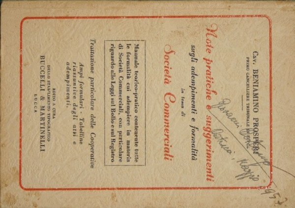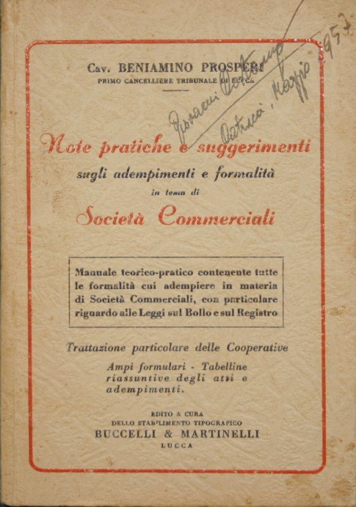 Manuale teorico pratico contenente tutte le formalità cui adempiere in materia di Società Commerciali, con particolare riguardo alle Leggi sul Bollo e sul Registro - Trattazione particolare delle Cooperative. Ampi formulari, tabelline riassuntive degli atti e adempimenti - in 16° - pp.126 - Brossura editoriale - Nota di possesso a penna alla brossura