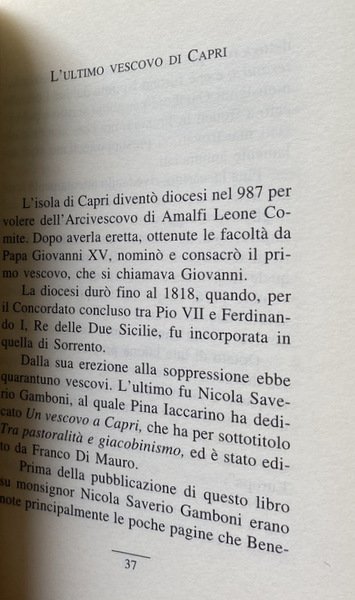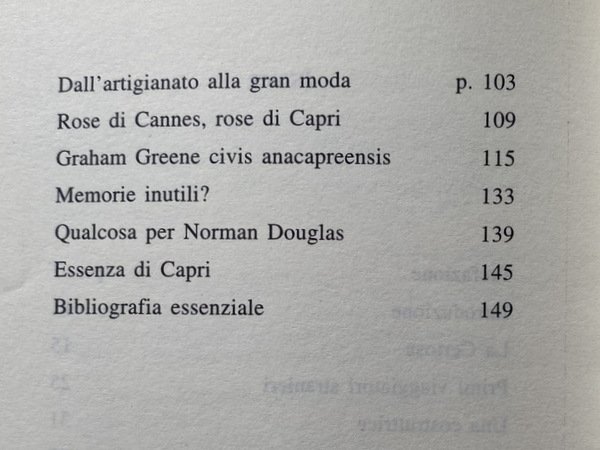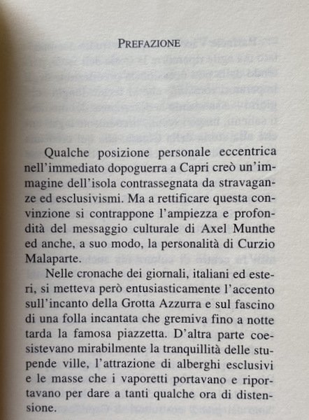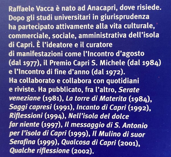 È una storia densa di suggestioni e di racconti e, nello stesso tempo, problematica e sfaccettata come quella che concerne l'affascinante isola di Capri, non la si può aggredire con arroganza: essa va contattata con prudenza e con garbo, va rivissuta e goduta per dettagli, va aiutata a definirsi o a lievitare, contribuendo ogni volta a precisare un particolare svisato o alterato. E molti sono i particolari che Vacca, senza gridarlo, ha precisato in queste note. Garbata e intensa la prefazione di Giulio Andreotti.