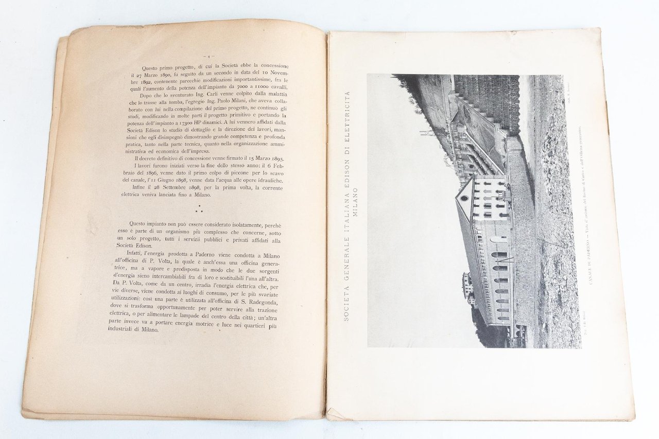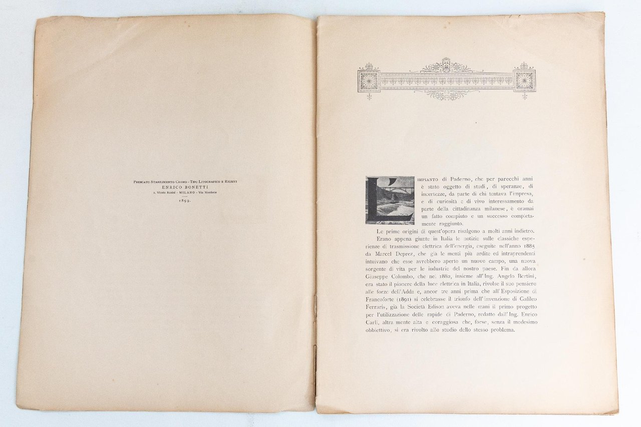 In folio, mm 320x235, pp. 16, con 9 belle tavole fotografiche fuori testo. Brossura editoriale a stampa con titoli blu incorniciati al centro del piatto. Fioriture sparse ai margini della brossura, lievi, altrimenti ottimo esemplare. Si tratta della prima pubblicazione aziendale della società Edison, stampata per l'inaugurazione della centrale di Paderno d'Adda, fu la prima centrale idroelettrica costruita dalla Edison che già l'anno prima aveva inaugurato la centrale termoelettrica di Porta Volta e nel 1883 quella di Redegonda. Le macchine generatrici installate (9.500 Kw) sono per l'epoca le più potenti d'Europa. La centrale è collegata a Milano con una linea elettrica lunga 32 km. È la prima volta che una tensione di tale potenza, elevatissima per l'epoca (13.500 Volt), percorre una tale distanza per essere sfruttata in un luogo diverso da quello di produzione. In queste densissime 16 pagine vengono percorse tutte le tappe della costruzione della centrale, con dovizia di particolari: sono citate tutte le aziende italiane che contribuirono alla costruzione della Centrale: Pirelli per i cavi elettrici, Guzzi Ravizza per il motore; Riva Monneret & C. per le turbine, Richard Ginori per gli isolatori, eccetera. Tra i numerosi ingegneri che collaborarono all'impresa vengono nominati Angelo Bertini, Carlo Esterle, Guido Semenza, Enrico Carli e Paolo Milani. La centrale è in funzione ancora oggi. Raro, 2 copie nelle biblioteche italiane, nessuna all'estero (ICCU e Worldcat).. *** TUTTI I NOSTRI LIBRI SONO VISIBILI PREVIO CONTATTO MAIL O TELEFONO NELLA NUOVA SEDE DI MILANO: LIBRERIA COSMOPOLIS, VIA JOMMELLI, 22. ***
