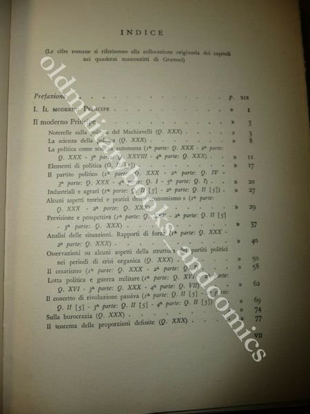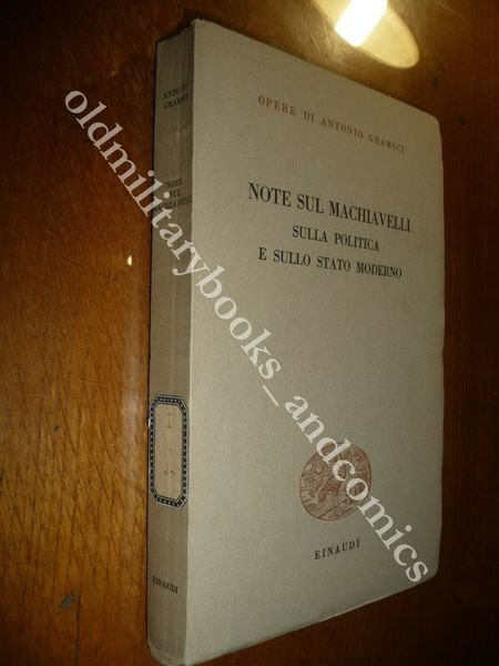 DESCRIZIONE: Einaudi Ed. Torino 1953 III^ Ed., br. ed., pp. 371 in 8°. Il moderno Principe. Note di politica internazionale. Note sull'attrezzamento nazionale e sulla politica italiana. Recensioni e note bibliografiche. Azione Cattolica. Gesuiti e Modernisti. Americanismo e fordismo. I problemi del partito della classe operaia e della fondazione del nuovo Stato, le questioni del moderno Principe, come "intellettuale collettivo". Opera a tutt'oggi imprescindibile in relazione agli studi machiavelliani. Le notevoli intuizioni gramsciane rappresentano fonte unica per gli studiosi delle dottrine politiche. CONDIZIONI: Ottime, il vecchio proprietario, un matematico, era stato Preside di Liceo, e Docente Universitario. Questo libro proviene dalla sua importante biblioteca privata, per cui alla prima bianca sono riportati i codici di catalogazione oltre all’etichetta sul dorso. PESO / WEIGHT: 500 gr. without package