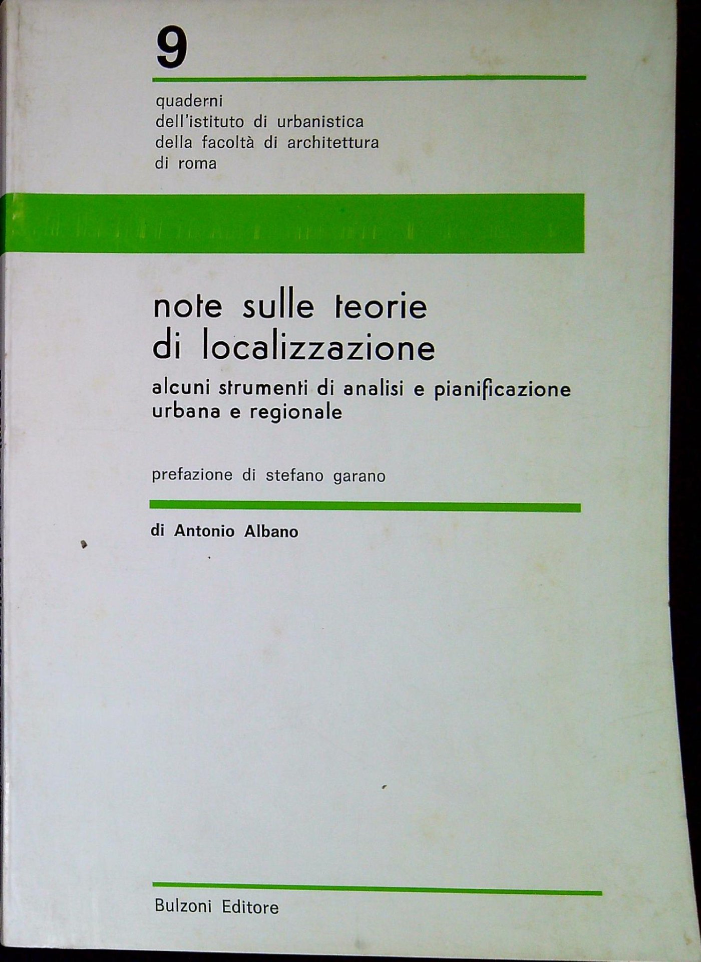 Albano, Antonio Note sulle teorie di localizzazione : alcuni strumenti di analisi e pianificazione urbana e regionale. Roma, Bulzoni 1979, 77 p., 10 c. di tav. : ill. ; 24 cm (42988)