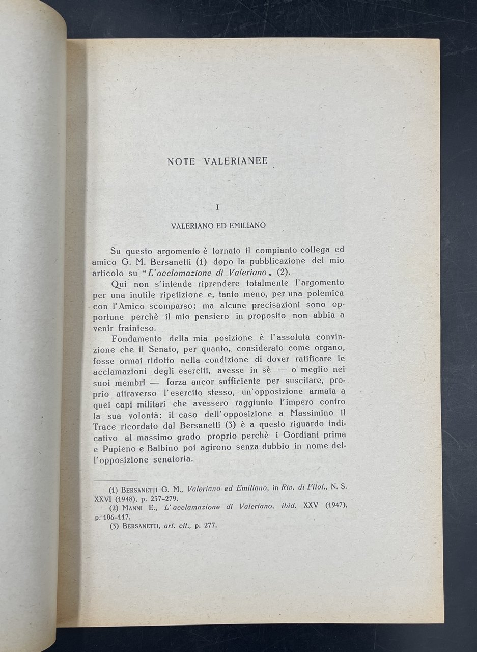 In-8°, pp. 32. Bross. edit. Valerian ed Emiliano. Valeriano e Sapore. data dell'arrivo di valeriano in Oriente. MANNI, docente di storia antica all'Università di Palermo. Nel capoluogo siciliano, fondò la rivista Kokalos. Studi pubblicati dall'Istituto di storia antica dell'Università di Palermo (1955), il Centro siciliano di studi storico-archeologici "Biagio Pace" (1957), e l'Istituto siciliano per la storia antica (1968)