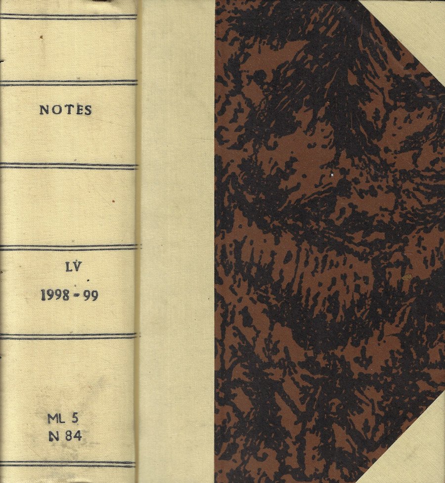 Annata completa in quattro numeri, n. 1-2-3-4 rispettivamente del settembre 1998-dicembre 1998-marzo 1999-giugno 1999, della rivista trimestrale della Music Library Association. Mezza legatura con angoli in tela chiara e piatti marmorizzati, con titoli in nero solo al dorso ed in buono stato generale. Pagine ben conservate, salde, con ampio margine e note al piede, con testo a due colonne e corredate da spartiti musicali nel testo. Numero complessivo pagine 1096 con numerazione consecutiva.