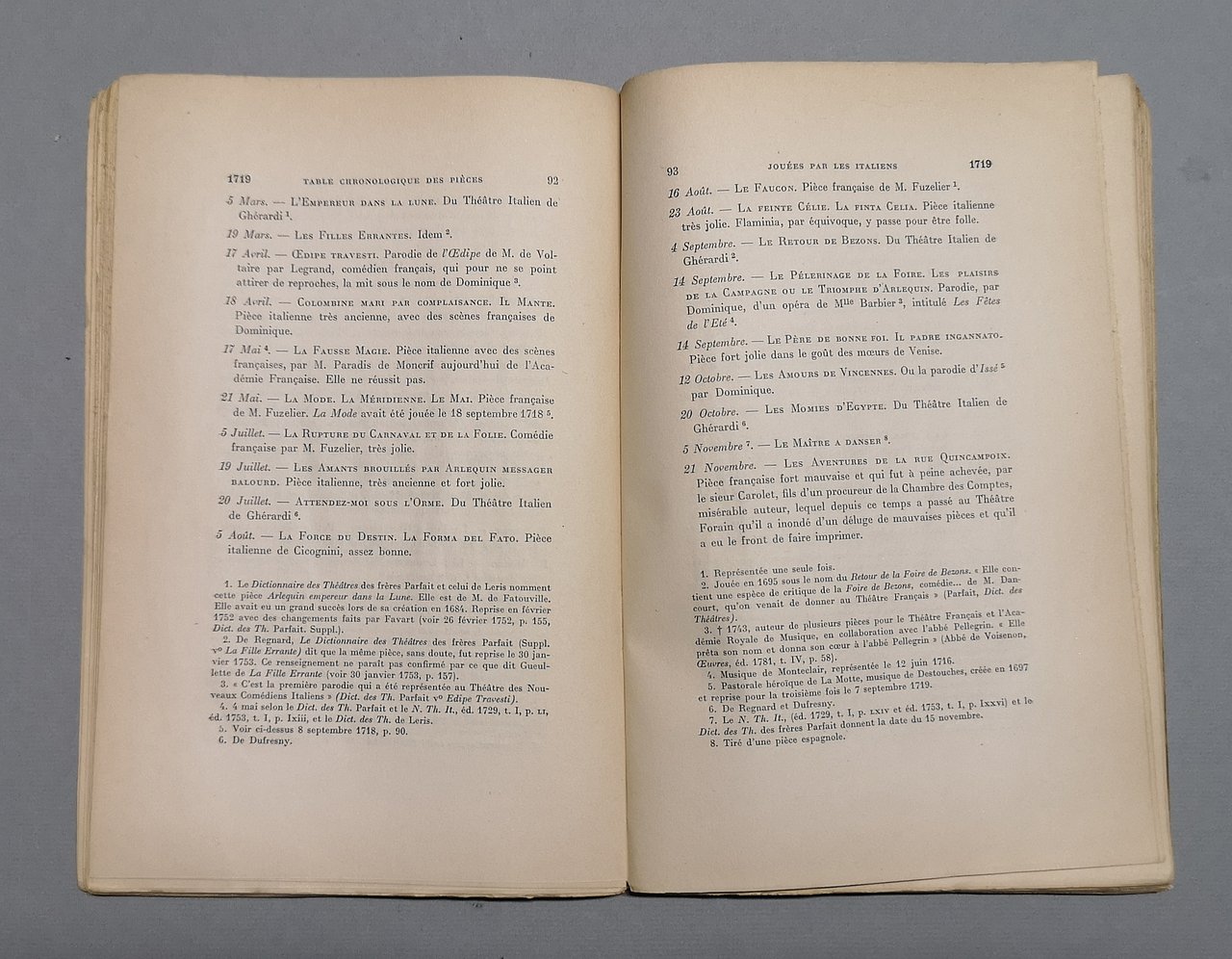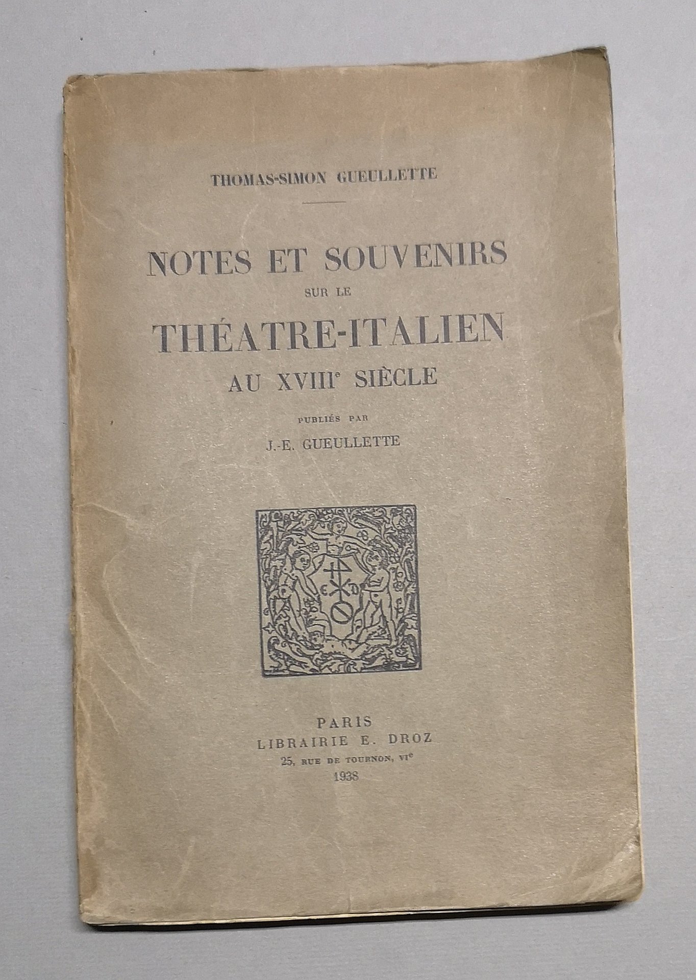 >in-8, pp. 217, (3), broch. edit. Raccoltà di documenti e piccole curiosità sul teatro italiano del XVIII secolo. Monografia scritta da dotto personaggio del tempo, Th.Simon Guellette, amico dei Riccoboni ed assiduo spettatore ai loro spettacoli, che iniziò a redarre nel 1734 la presente storia del Teatro Italiano in Francia nel XVII e XVIII secolo, con notizie biografiche degli attori e la cronolgia degli spettacoli dal 1716 al 1762. Termina con il testo di lettere inedite dei commedianti.