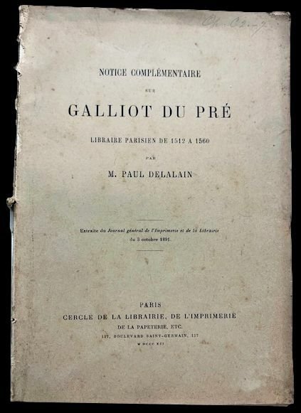 In 4°; 24 pp. Brossura editoriale, il solo piatto anteriore. Prima edizione in forma singola di questo articolo dedicato al libraio ed editore parigino, Galliot du Pré (-aprile 1560). Nel maggio 1514 la Cancelleria reale di Luigi XII concesse a du Pré il privilegio dei diritti esclusivi, cosa che poi fu confermato nel 1515 da Francesco I. La marca tipografico di Galliot du Pré presentava una nave con un angelo che suonava una tromba, che emette le parole "La vogue du guallee". Buono stato di conservazione.