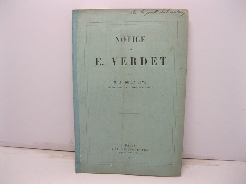 In 8, pp. 28. Omaggio autogr dell'A. al p. ant. Br. ed. Notizie relative agli studi del fisico francese Emile Verdet (1824-1866).