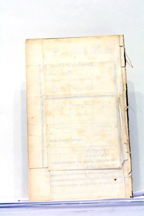16 pages, un grand tableau dépliant (20x12cm). Broché. Rousseurs. Pharmacie. Ecorce. Amériques. Grand tableau dépliant (44x63cm) intitulé "Tableau Synoptique présentant l'essai Analytique, l'indication de quelques Préparations Pharmaceutiques et les Propriétés Médicinales d'une Substance Végétale nouvellement importée de l'Amérique du Sud, et connue sous le nom de Monésia".