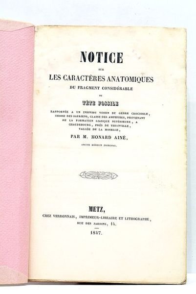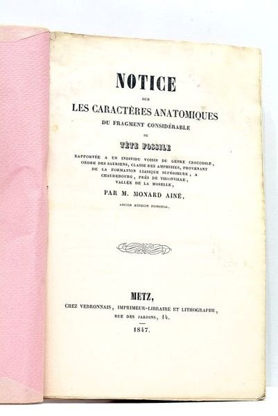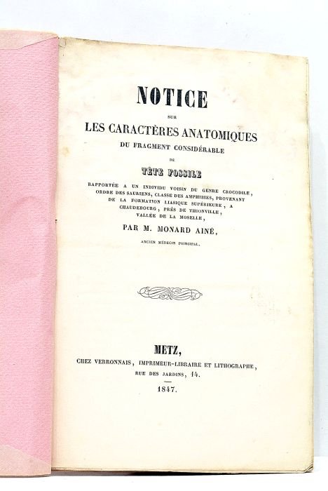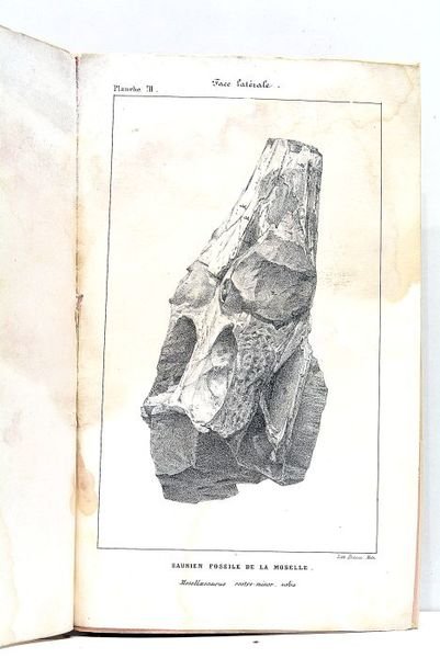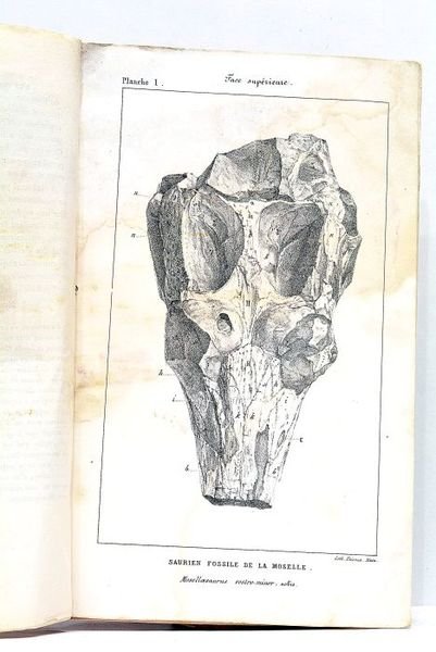 in-8. 15pp. 3 planches hors-texte. Broché, couverture moderne protégée par du papier cristal. Rare impression de Metz de cette étude sur le fossile d'une sorte de crocodile trouvé en pays messin. Elle est illustrée de 3 belles gravures représentant la découverte. Mouillures, prononcées sur les planches.