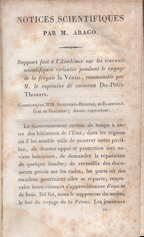 Rapport fait à l'Académie sur les travaux scoinetifiques exécutès pendant le voyage de la frégate la Vénus, commandée par M. le capitaine de vaisseau Du-Petit-Thouars. Manca il frontespizio. Estratto pp. 255-393
