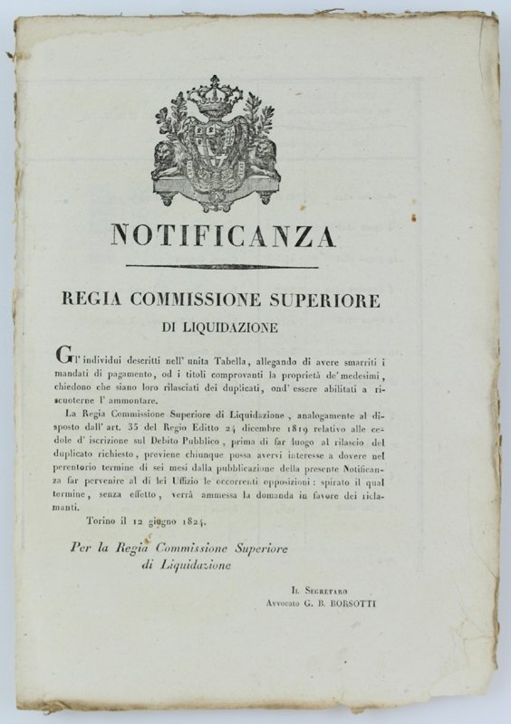 NOTIFICANZA - REGIA COMMISSIONE SUPERIORE DI LIQUIDAZIONE.