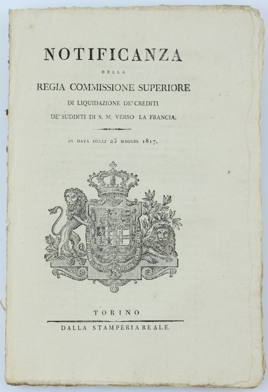 NOTIFICANZA DELLA REGIA COMMISSIONE SUPERIORE DI LIQUIDAZIONE DE' CREDITI DE' SUDDITI DI S.M. VERSO LA FRANCIA. In data 23 maggio 1817.