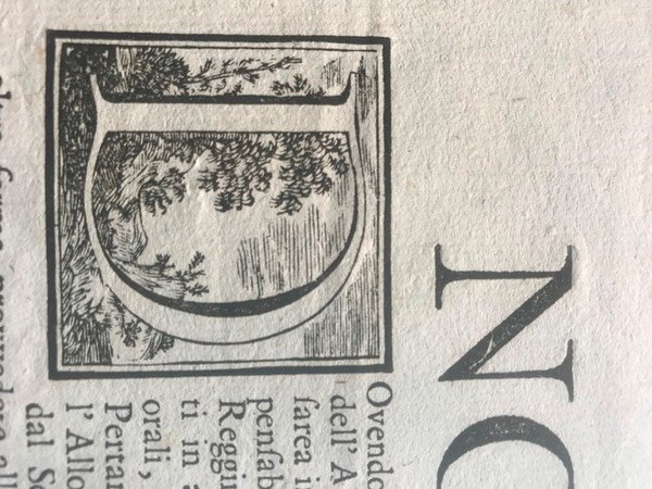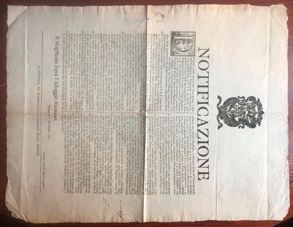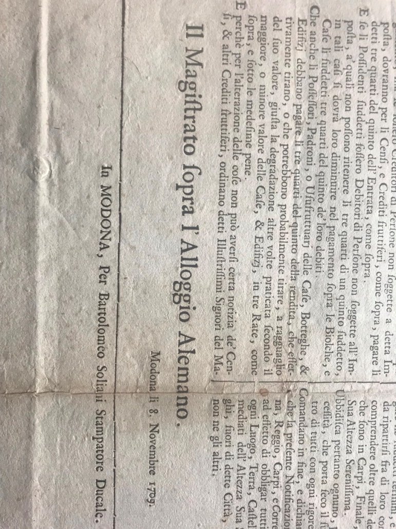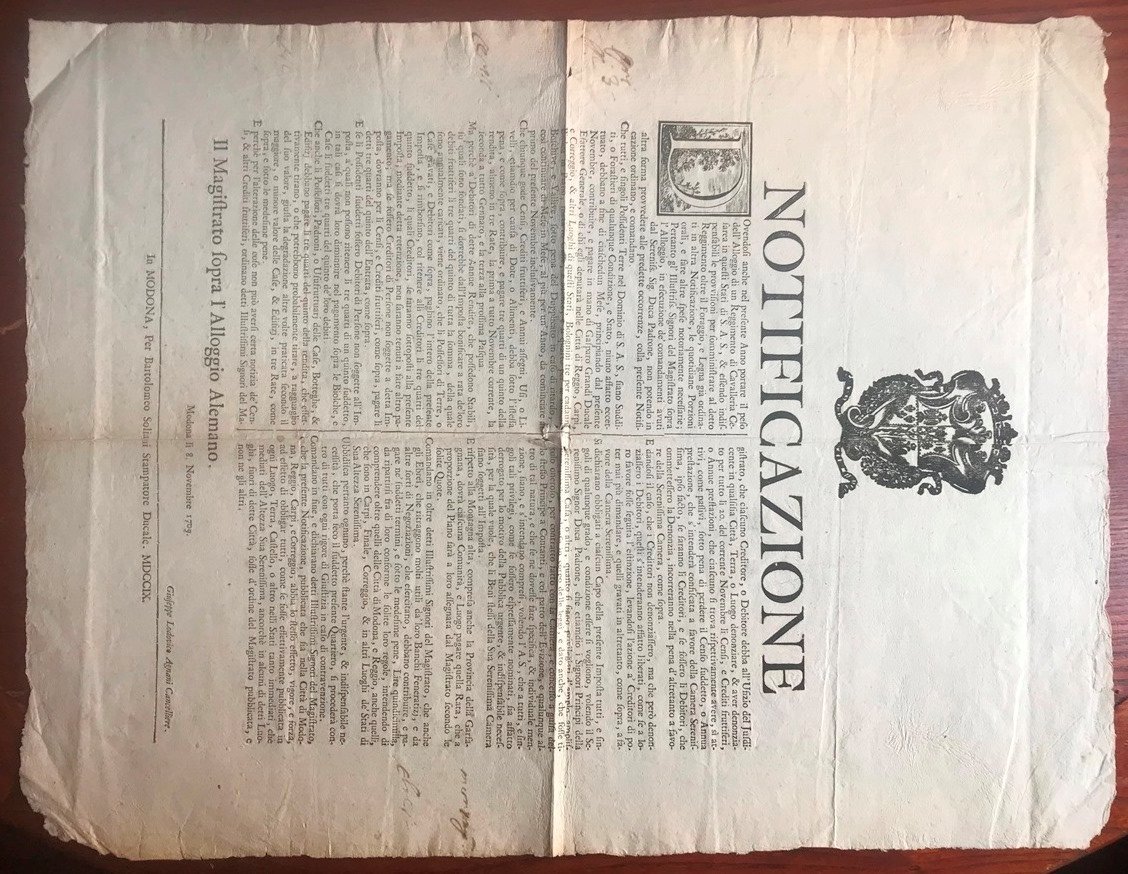 Bando cm 35x53 intestato con stemma silografico con l'Arme del Duca di Modena in cui si sancisce la gabella cui la popolazione sar sottoposta per il mantenimento di un reggimento di cavalleria imperiale di stanza nel comprensorio modenese (curiosa la citazione degli 'Ebrei, che ritraggono molti utili da' loro Banchi Feneratizj, e da altre sorti di Negoziazioni' tassati di 15.000 lire). Piegature nel mezzo del foglio, piccolo strappo senza mancanza all'unione delle piegature, lieve brunitura. Raro ed in pi che buone condizioni.