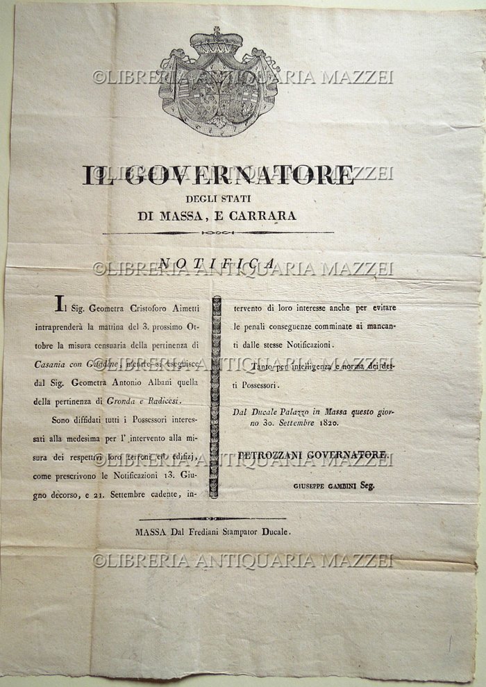 Un foglio di 45 x 31 cm, con stemma xilografato in testa. Testo su due colonne. Al verso, nota a inchiostro, di mano coeva, che riporta la data e, in breve, il contenuto del documento. Vecchi segni di piegature. Tre piccolissimi fori lungo una delle piegature, per il resto, ben conservato. Dato in Massa, dal Ducale Palazzo, il 30 settembre 1820.